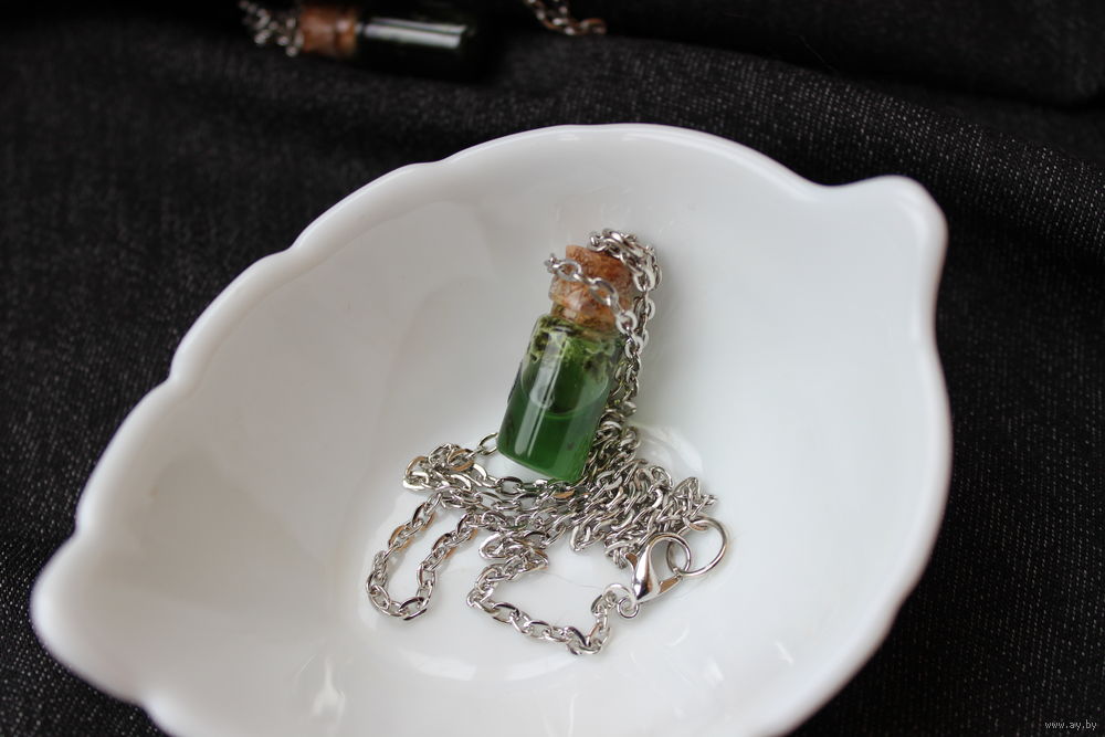 Кулон на стальной цепочке (не ржавеет, не темнеет). Стекло, волшебная жидкость, плотно запаян, не течет, невозможно открыть.