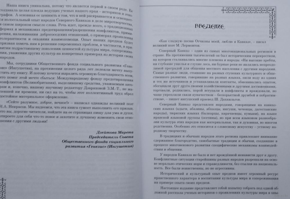 Большой энциклопедический формат. Мелованный альбом. Ляссе. Тираж 800 экз. 200 стр. Книга представляет собой сборник авторских очерков ведущих ученых-историков Северного Кавказа о проявлениях культуры мира в опыте общения и традициях народов Северного Кавказа. Основной целью издания является не только расширение знания подрастающих поколений о своём родном крае, но и раскрытие огромного миротворческого потенциала традиций и обычаев народов Северного Кавказа. Книга адресована подросткам, молодежи, учителям, работающим в сфере гражданского образования и воспитания в духе культуры мира, а также все тем, кто проявляет интерес к идеям миротворческого и гражданского образования, к истории и этнографии Северного Кавказа. Мелованная бумага.