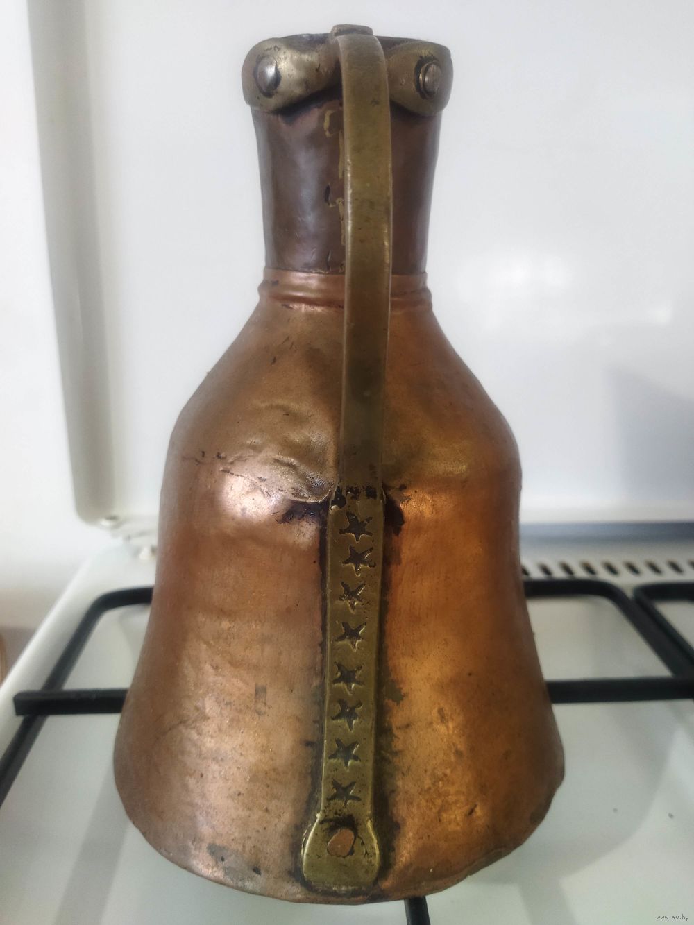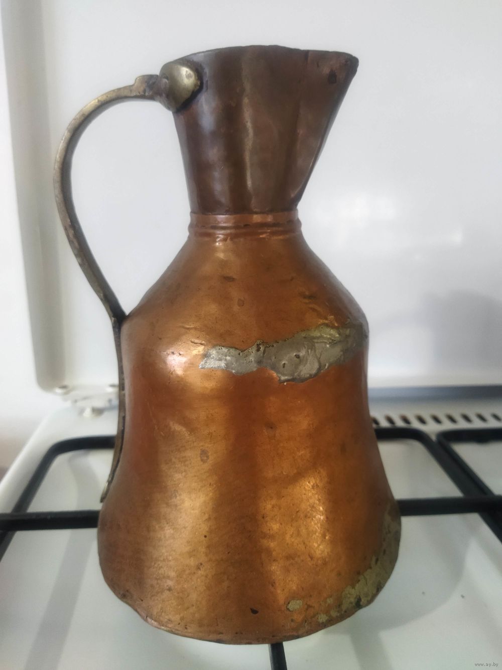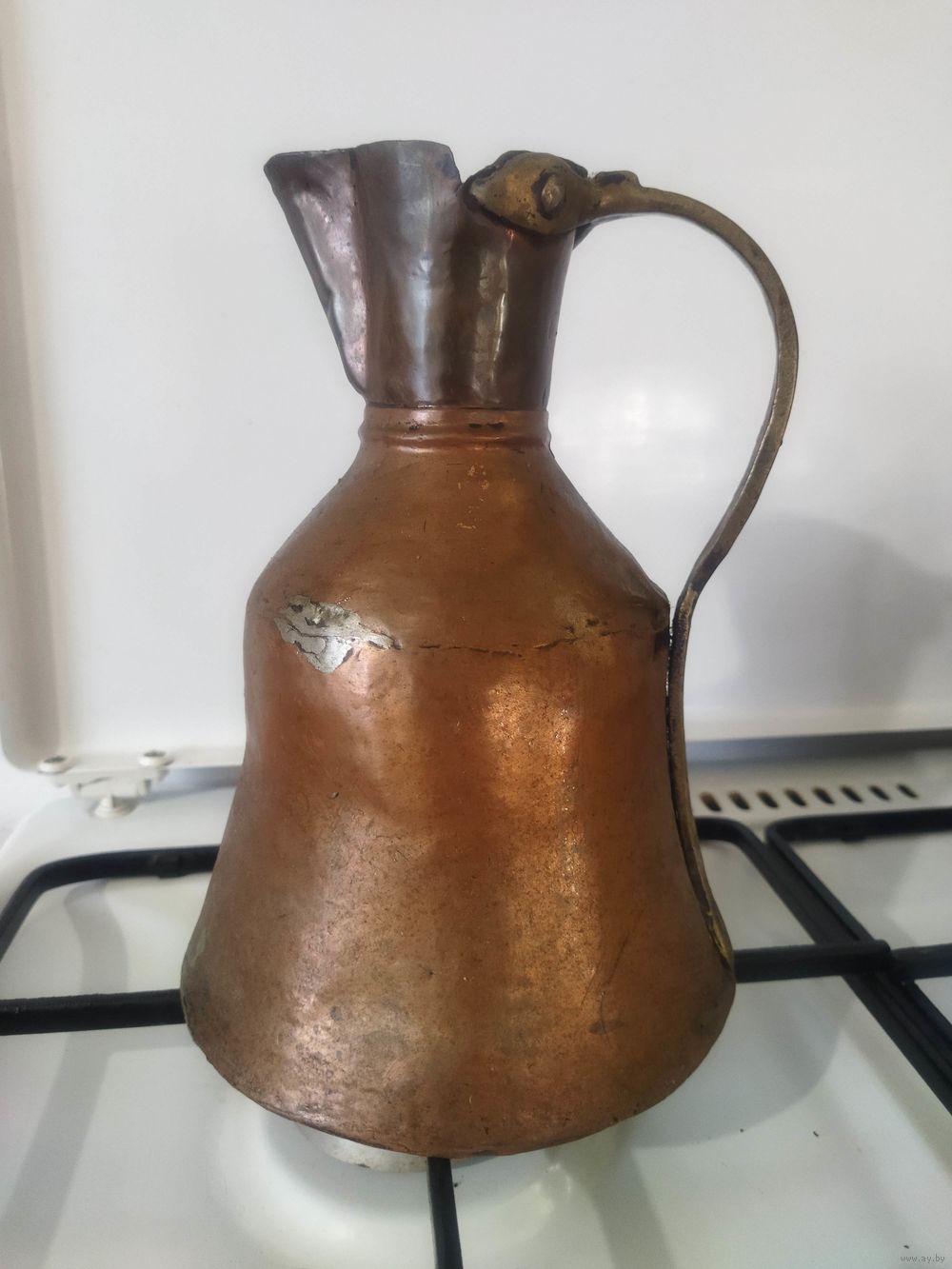 Старинный кумган . Лет сто ему будет, не менее. Из меди, бронзовая ручка и заклёпки. Рост 22 см, вес 700 г. Для музея (может остался от набега татар 1506 года ) или коллекции. Старт по цене металла. Если подпаять, можно и пользоваться.