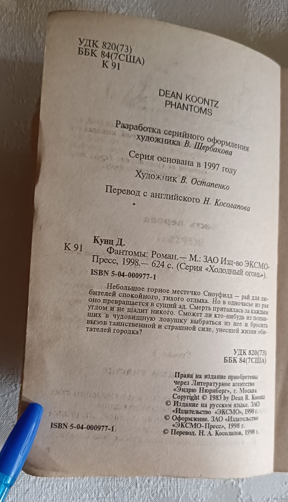 Кунц Дин. Фантомы: Роман. — М.: ЗАО Изд-во ЭКСМО-Пресс, 1998. - 624 с. (Серия «Холодный огонь»), мягкая обложка, уменьшенный формат.