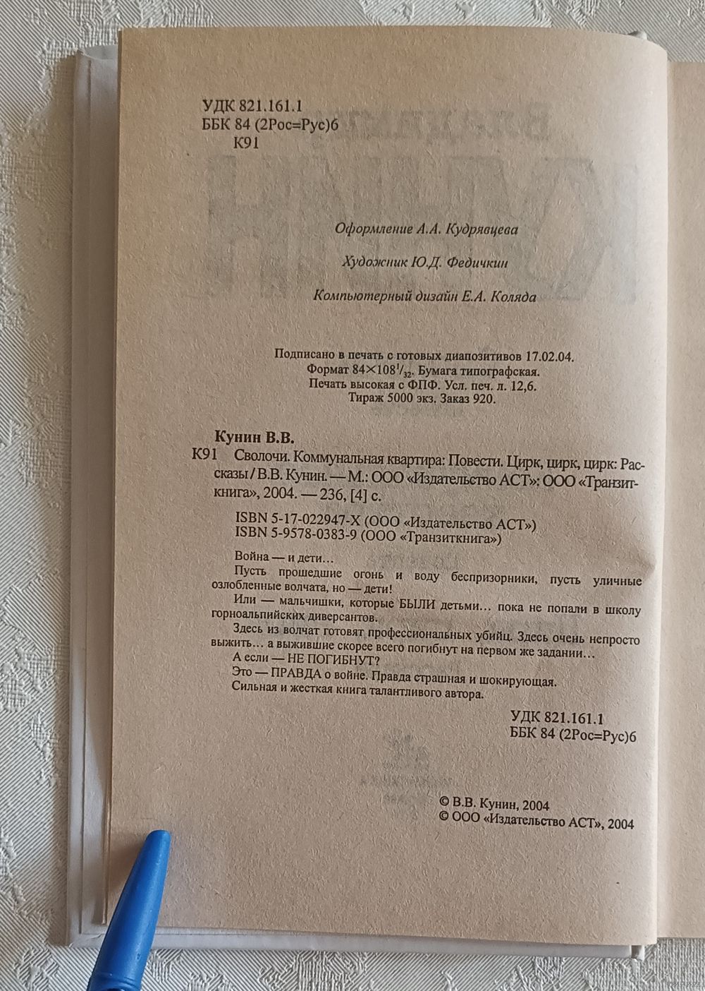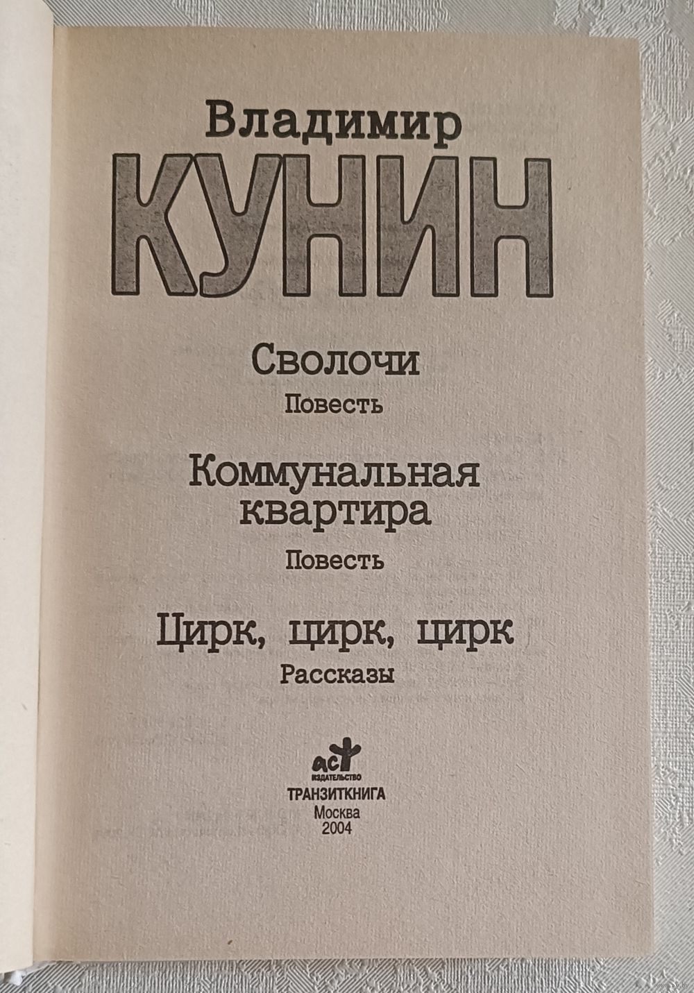 Кунин Владимир. Сволочи. Коммунальная квартира: Повести. Цирк, цирк, цирк: Рассказы. М.: ООО «Издательство АСТ»: ООО «Транзит-книга», 2004.-236, [4] с., твердый переплет, обычный формат.