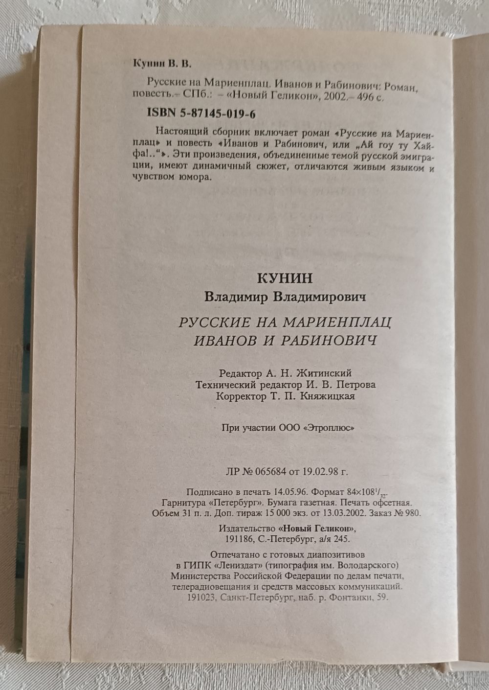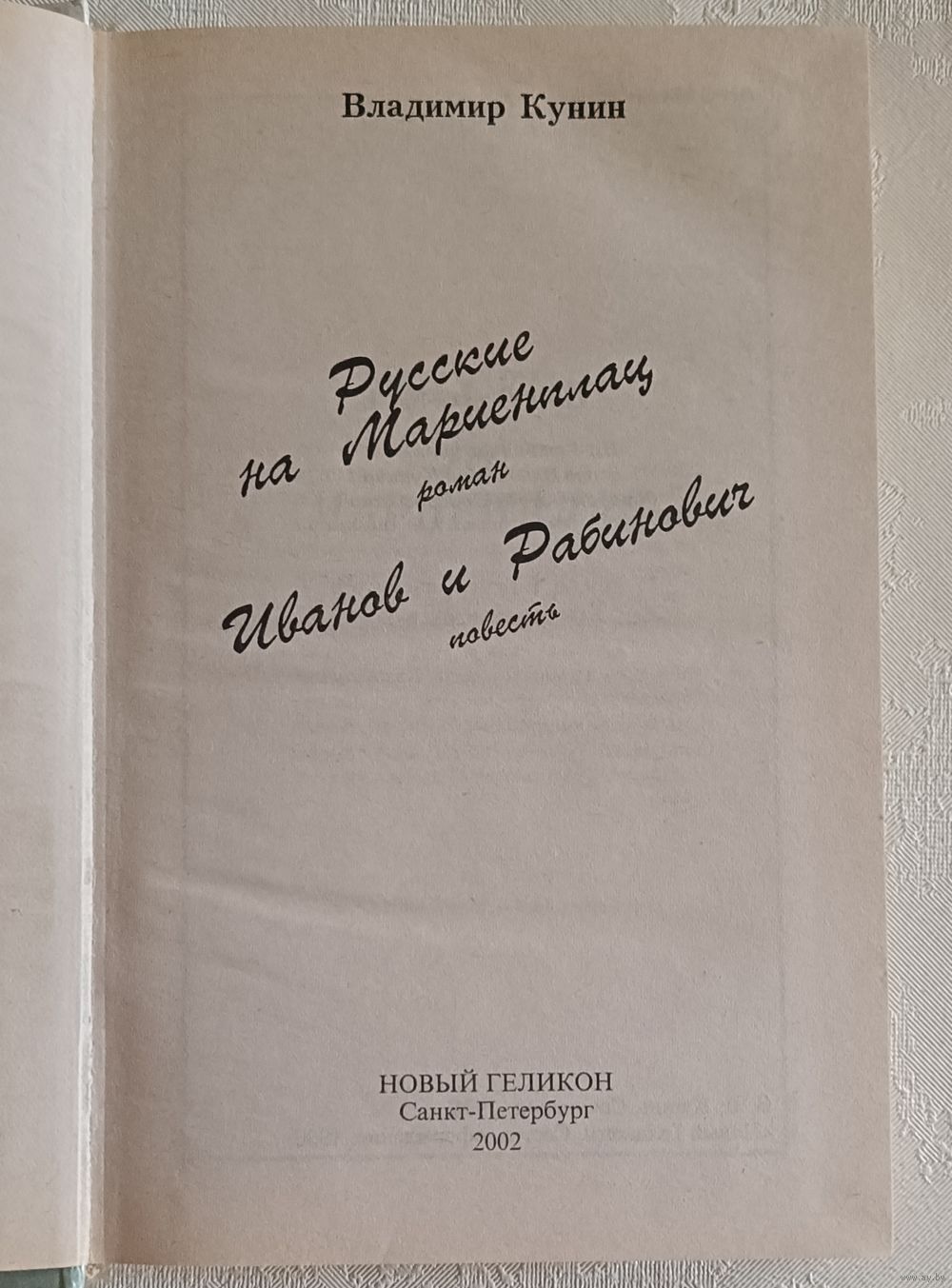 Кунни Владимир. Русские на Мариенплац. Иванов и Рабинович: Роман, повесть. СПб.: «Новый Геликон», 2002.-496 с., твердый переплет, обычный формат