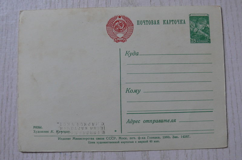 Купецио К., Розы; 1960, чистая, ДМПК, герб красный, штамп переоценки.
