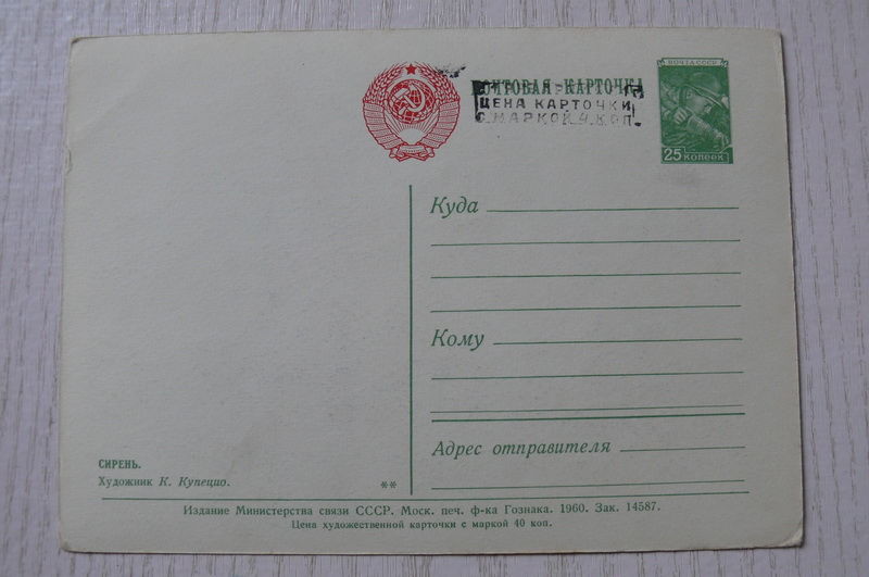 Купецио К., Сирень; 1960, чистая, ДМПК, герб красный, штамп переоценки.