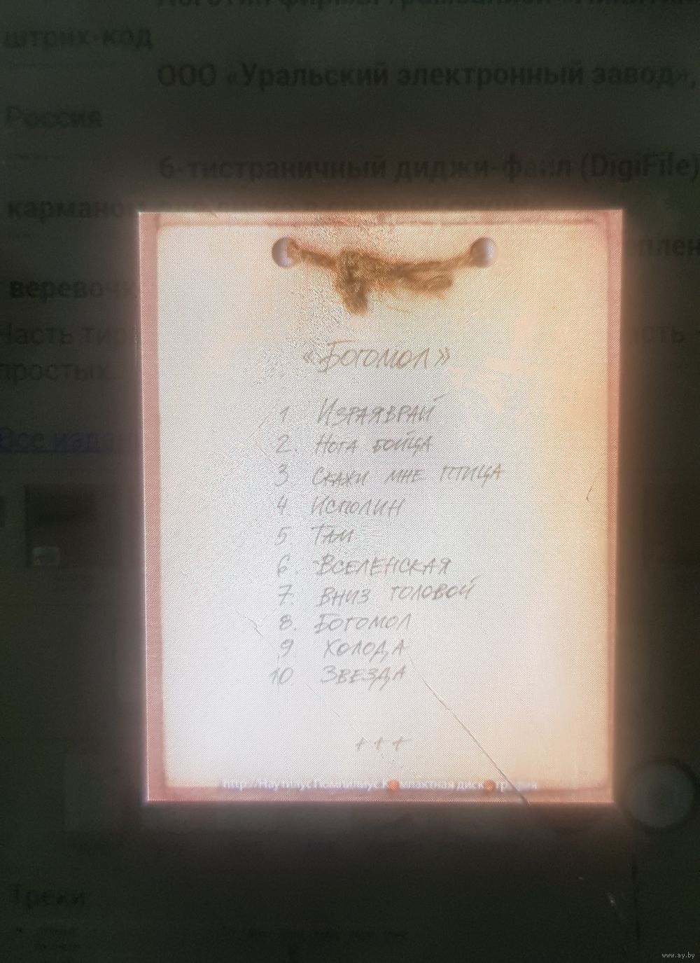 Куплю только В Минске напрямую недорого Фирменный Диск "Ю-Питер-Богомол" с 6-страничными диджи-файлом (DigiFile) с карманом для диска в средней секции, с 13 листов с текстами песен со скрепленной веревкой, лейбл: Фирма Гранзаписи Никитин, Производитель: ООО "Уральский Электронный Завод" Страна Россия, Код Диска: IFPI 1I10, Код Матрицы: IFPI L641, Номер Матрицы: ТФН-CD 529/08. ДРУГИЕ ВАРИАНТЫ С 4-СТРАНИЧНЫМИ БУКЛЕАТМИ КАТЕГОРИЧЕСКИ НЕ ПРЕДЛГАТЬ ТОЛЬКО С МНОГОСТРАНИЧНЫМИ БУКЛЕТАМИ ИНТЕРЕСУЕТ. ОПЛАТУ ПОЧТОЙ НЕ ПРЕДЛАГАТЬ В ВИДЕ ОТСУТСТВИИ ПЛАТНОЙ КАРТЫ. Условий оплаты только наличные и самовывоз ТОЛЬКО С МИНЯАНИНОМ СВЯЗЫВАЮСЬ в любые договорные дни в Минске (с 11:00 до 20:00 часов). Обязательно в крайнем случай звоните мой телефон указан слева в "Контактном Данном" (с 10:00 до 21:00 часов). ПОСЛЕ МОЕГО НАЖАТИЯ ПОКУПКИ ЛОТА ПИШИТЕ ПОЖАЛУЙСТА НА ЭЛЕКТРОННЫЙ АДРЕС ВИБЕРОМ И ДРУГИМИ СЕТЯМИ НЕ ПОЛЬЗУЮСЬ В КОММЕНТАРИЯХ ОСТАВЛЯТЬ НЕЛЬЗЯ.