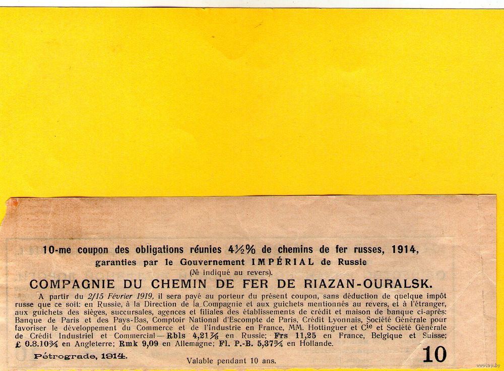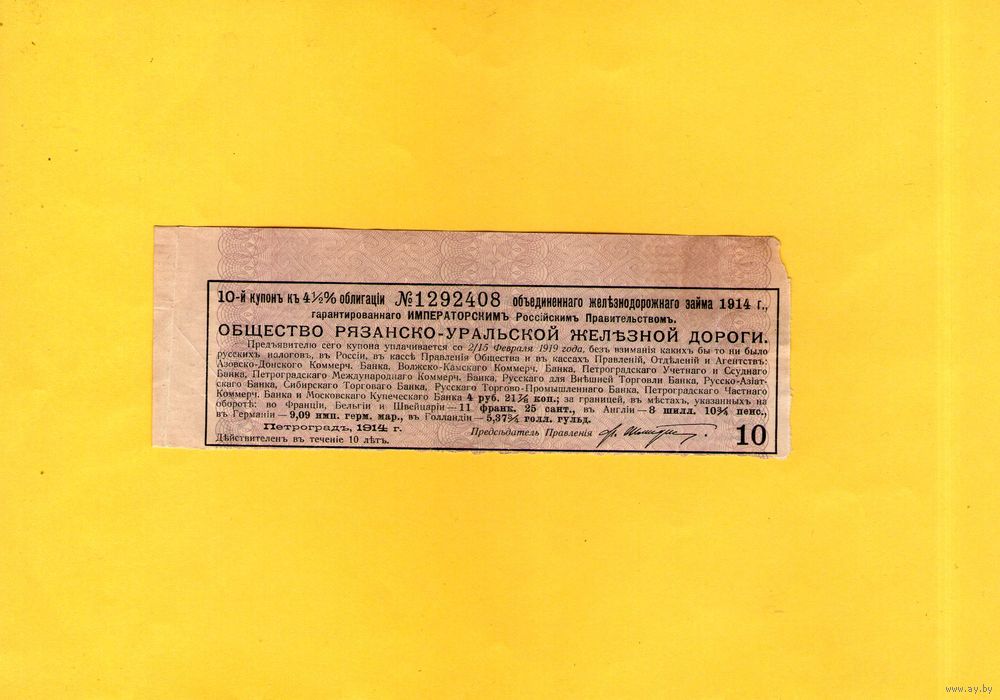 Купон. Общество Рязанско-Уральской железной дороги.
