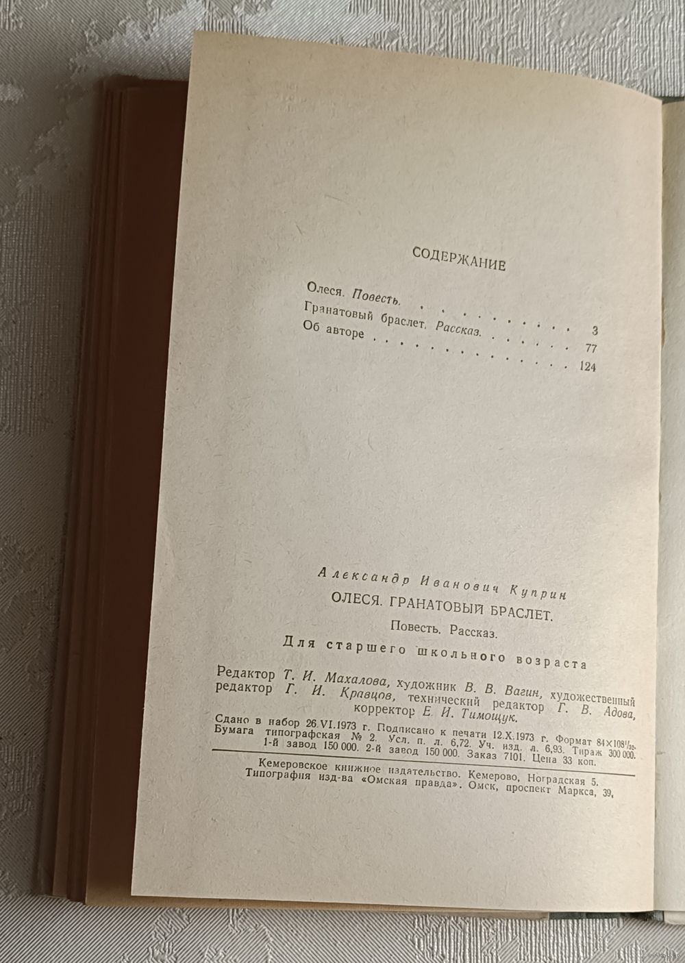 Куприн Александр. Олеся. Гранатовый браслет. Школьная серия. Кемерово. Кемеровское книжное издательство, 1974, 128 с.