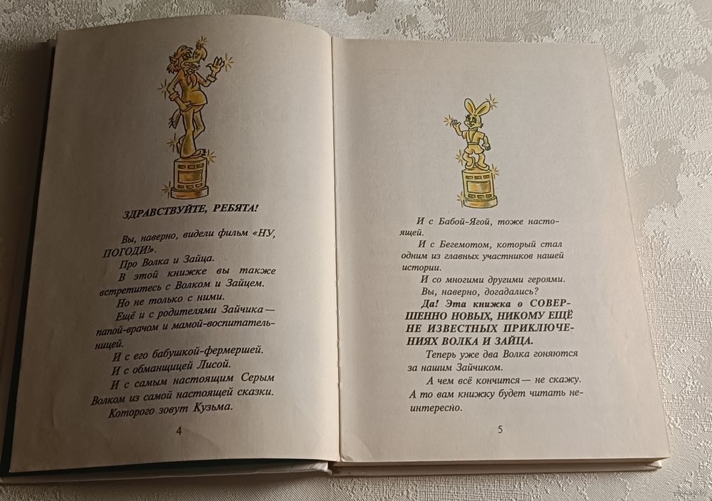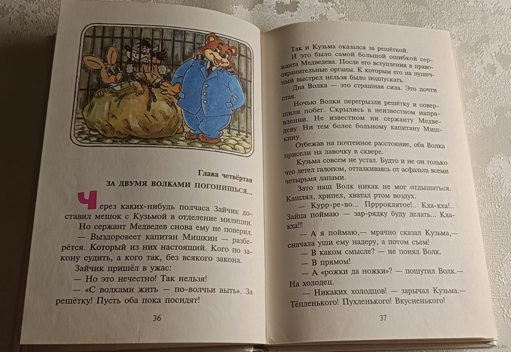 Вы, наверно, видели фильм «НУ, ПОГОДИ!». Про Волка и Зайца. В этой книжке вы также встретитесь с Волком и Зайцем. Но не только с ними. Ещё и с родителями Зайчика — папой-врачом и мамой-воспитательницей. И с его бабушкой-фермершей. И с обманщицей Лисой. И с самым настоящим Серым Волком из самой настоящей сказки. Которого зовут Кузьма.
