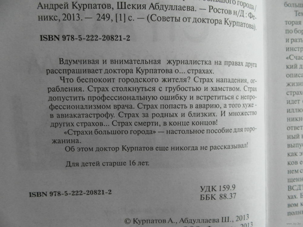 Красивая, умная, успешная журналистка на правах друга расспрашивает доктора Курпатова о... страхах. Что беспокоит городского жителя? Страх нападения, ограбления. Страх столкнуться с грубостью и хамством. Страх допустить профессиональную ошибку и встретиться с непрофессионализмом врача. Страх попасть в аварию, а того хуже - в авиакатастрофу. Страх за родных и близких. И множество других страхов... Страх смерти, в конце концов! Страхи большого города - настольное пособие для горожанина. Об этом доктор Курпатов еще никогда не рассказывал!