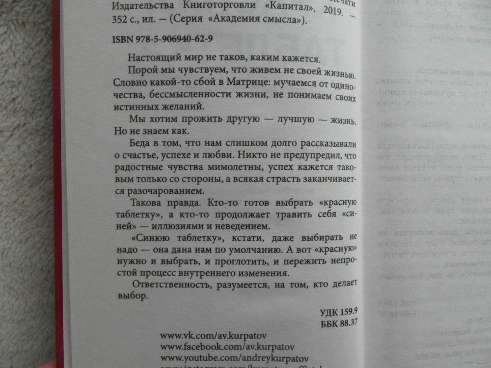 Настоящий мир не таков, каким кажется. Порой мы чувствуем, что живем не своей жизнью. Словно какой-то сбой в Матрице: мучаемся от одиночества, бессмысленности жизни, не понимаем своих истинных желаний. Мы хотим прожить другую - лучшую - жизнь. Но не знаем как. Беда в том, что нам слишком долго рассказывали о счастье, успехе и любви. Никто не предупредил, что радостные чувства мимолетны, успех кажется таковым только со стороны, а всякая страсть заканчивается разочарованием. Такова правда. Кто-то готов выбрать ``красную таблетку`` правды, а кто-то продолжает травить себя ``синей`` - иллюзиями и неведением. ``Синюю таблетку``, кстати, даже выбирать не надо - она дана нам по умолчанию. А вот ``красную`` нужно и выбрать, и проглотить, и пережить непростой процесс внутреннего изменения.