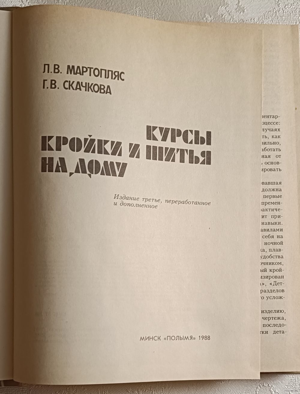 Мартопляс Л. В., Скачкова Г. В. Курсы кройки и шитья на дому. — 3-е изд., перераб. и доп.- Мн.: Полымя, 1988. — 335 с.: ил., твёрдый переплёт, увеличенный формат.