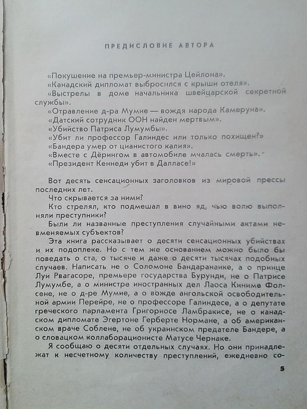 "Покушения на премьер-министра Цейлона", "Канадский дипломат выбросился с крыши отеля", "Выстрелы в доме начальника швейцарской секретной службы", "Отравление д-ра Мумие - вождя народа Камеруна", "Датский сотрудник ООН найден мертвым", "Убийства Патриса Лумумбы", "Убит ли профессор Галиндес или только похищен?", "Бандера умера от цианистого калия", "Вместе с Дерингом в автомобиле мчалась смерть", "Президент Кеннеди убит в Далласе". Эта книга рассказывает о десяти сенсационных убийствах и их подоплеке. Что скрывается за ними? Кто стрелял, кто подмешал в вино яд, чью волю выполняли преступники? Были ли названные преступления случайными актами невменяемых субъектов?
