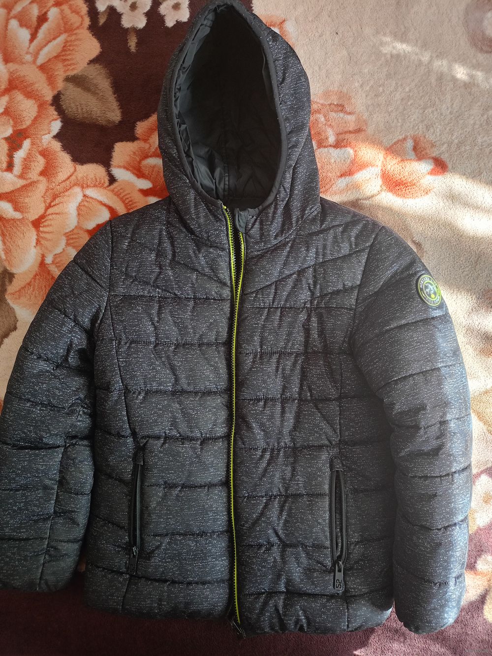 Куртка весна - осень. На рост 134 - 140, длина по спинке 57 см. ПОГ 44 см, ПОБ 42 см, к низу несколько заужена, резинка. Рукав 52 см. Куртка двухсторонняя. В хорошем состоянии.