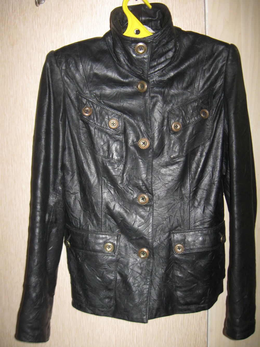 Куртка кожаная женская. Черного цвета, р 44, рост 158-164. Длина по спине 51 см, длина рукава от горловины 73 см, длина рукава 62 см, длина рукава по внутреннему шву 45 см, ПОГ 44 см.