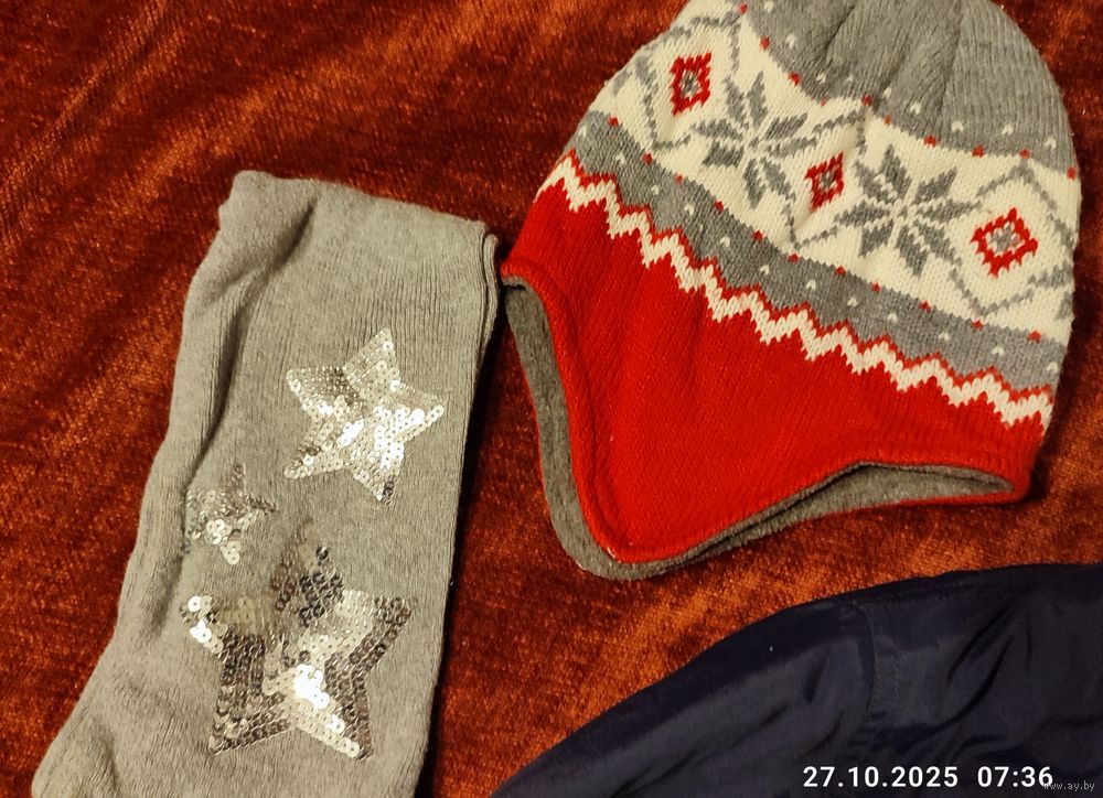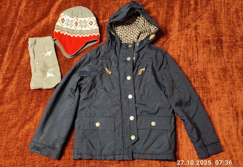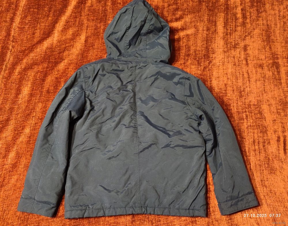 Демисезонная куртка темно синего цвета в хорошем состоянии. В комплекте шапка и шарф. Утепленная,внутри флисовая подкладка.