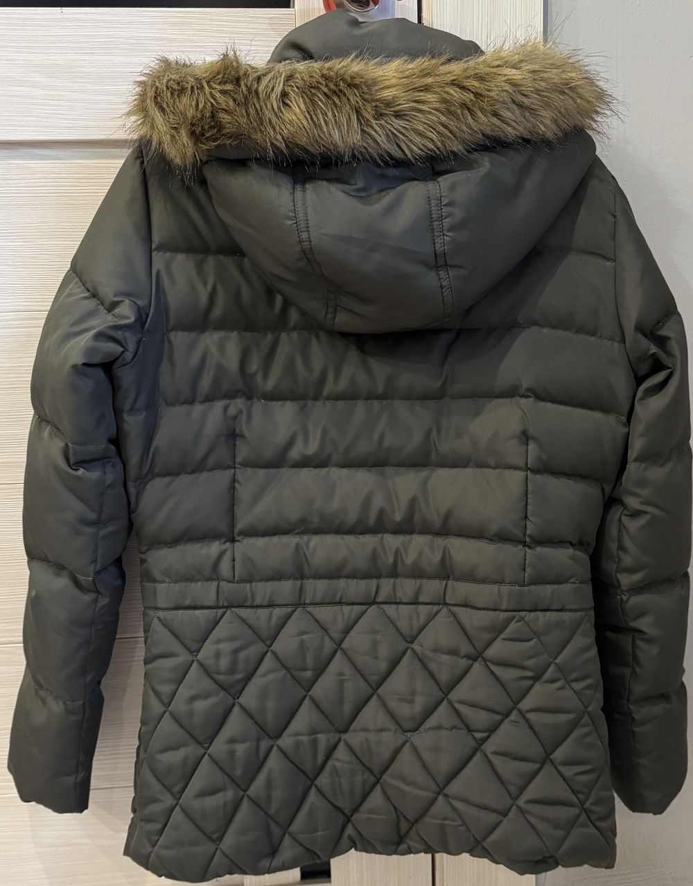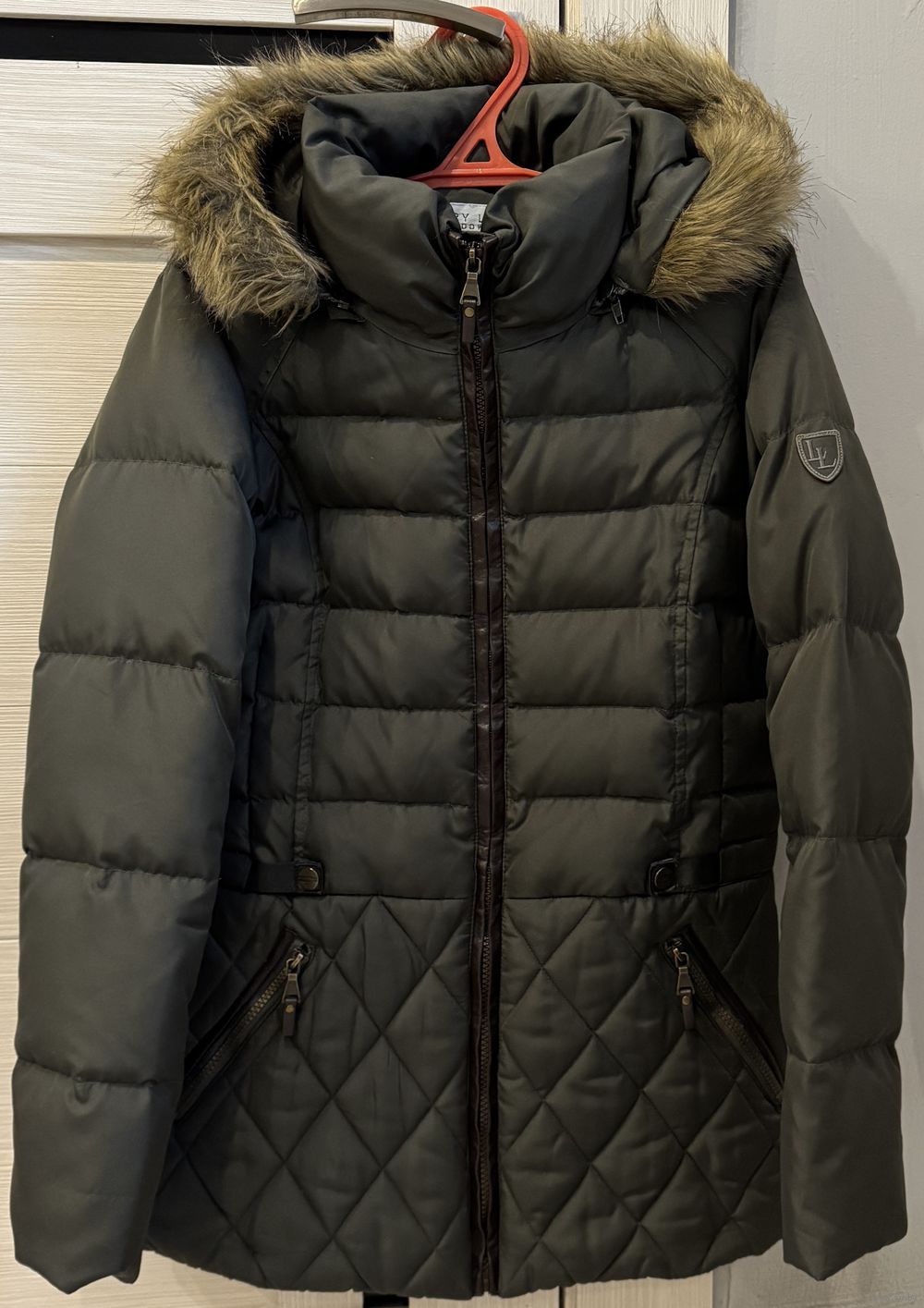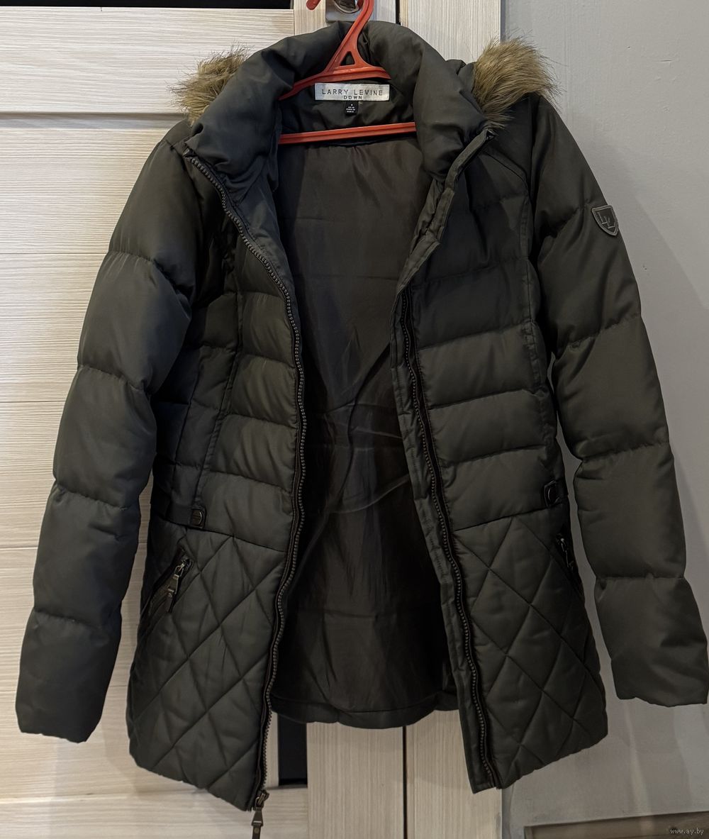 Куртка Larry Levine, размер по ярлыку европейский 36 (наш 42). Теплая, перо. Капюшон отстегивается. Цвет коричнево-зеленый/хаки (в зависимости от освещения). Без дефектов.