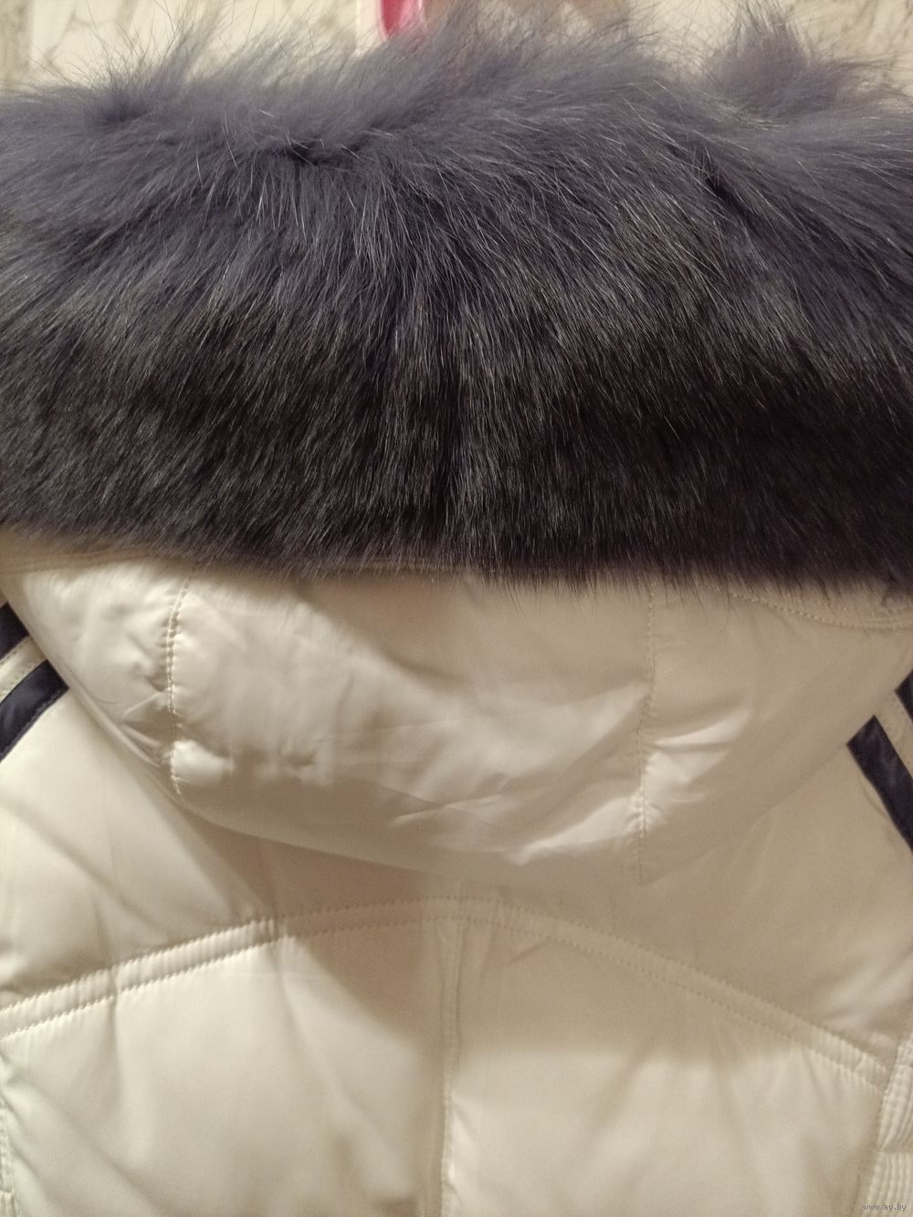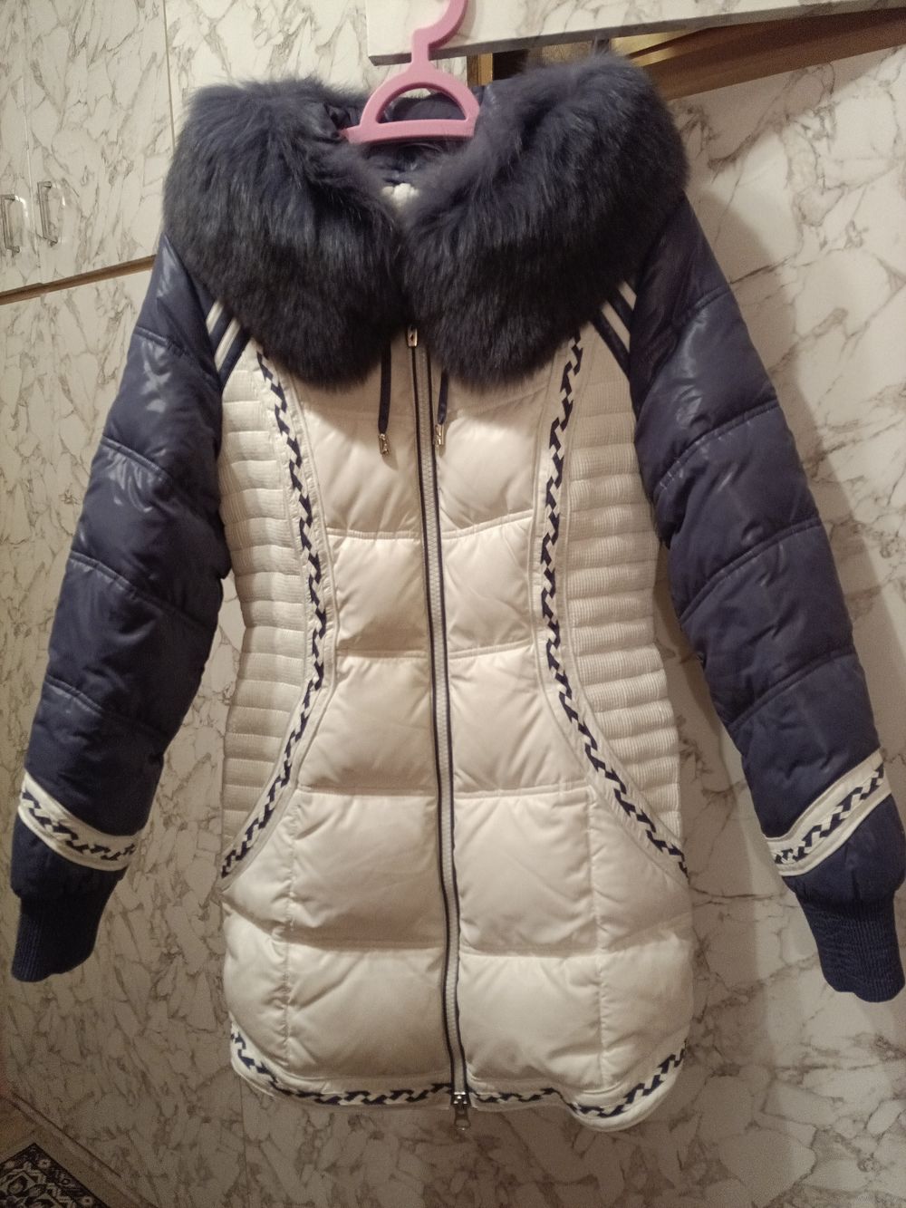 Практически новый пуховик. Длина по спинке 79 см. Длина рукава 63 см. Цвет сиренево-белый., с капюшоном. Мех на капюшоне - крашеная лиса отстёгивается, есть пояс, но можно носить и без него