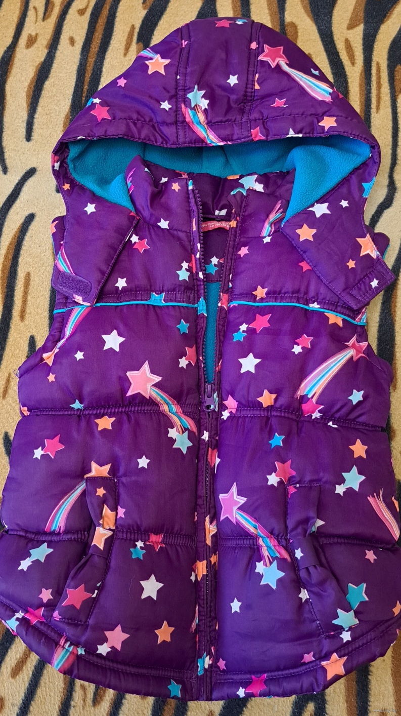 Куртка-жилетка фиолетовая в звезды на флисе на девочку, на 6-8лет, б.ув отличном состоянии, очень теплая. Полуобхват груди-34см, длина изделия-48см.
