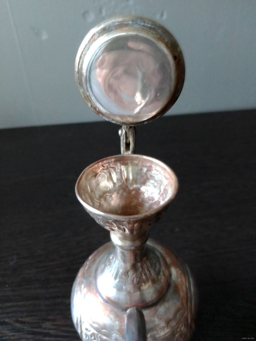 кувшин медный посеребре́нный , имеет небольшую течь по пайке на стыке , высота кувшина 17 см .