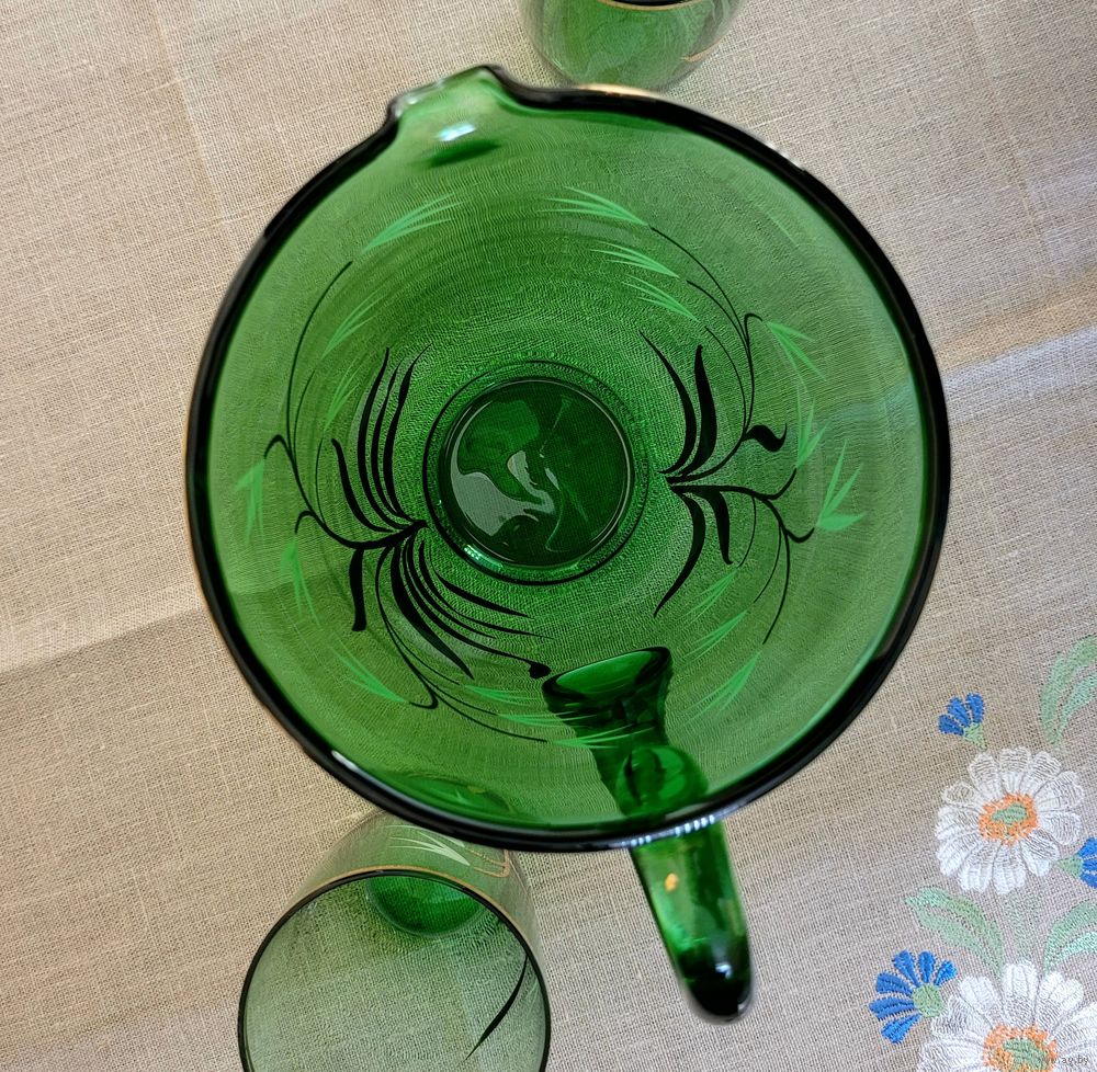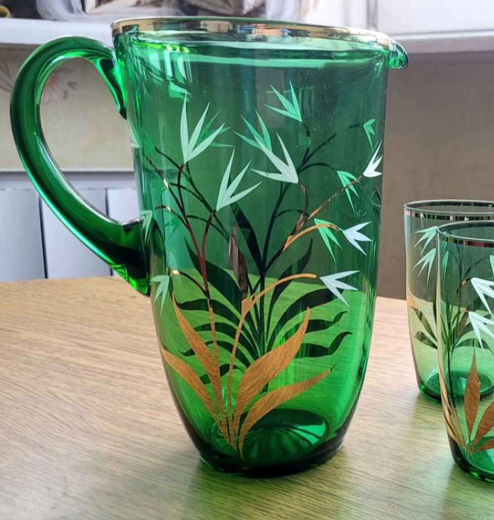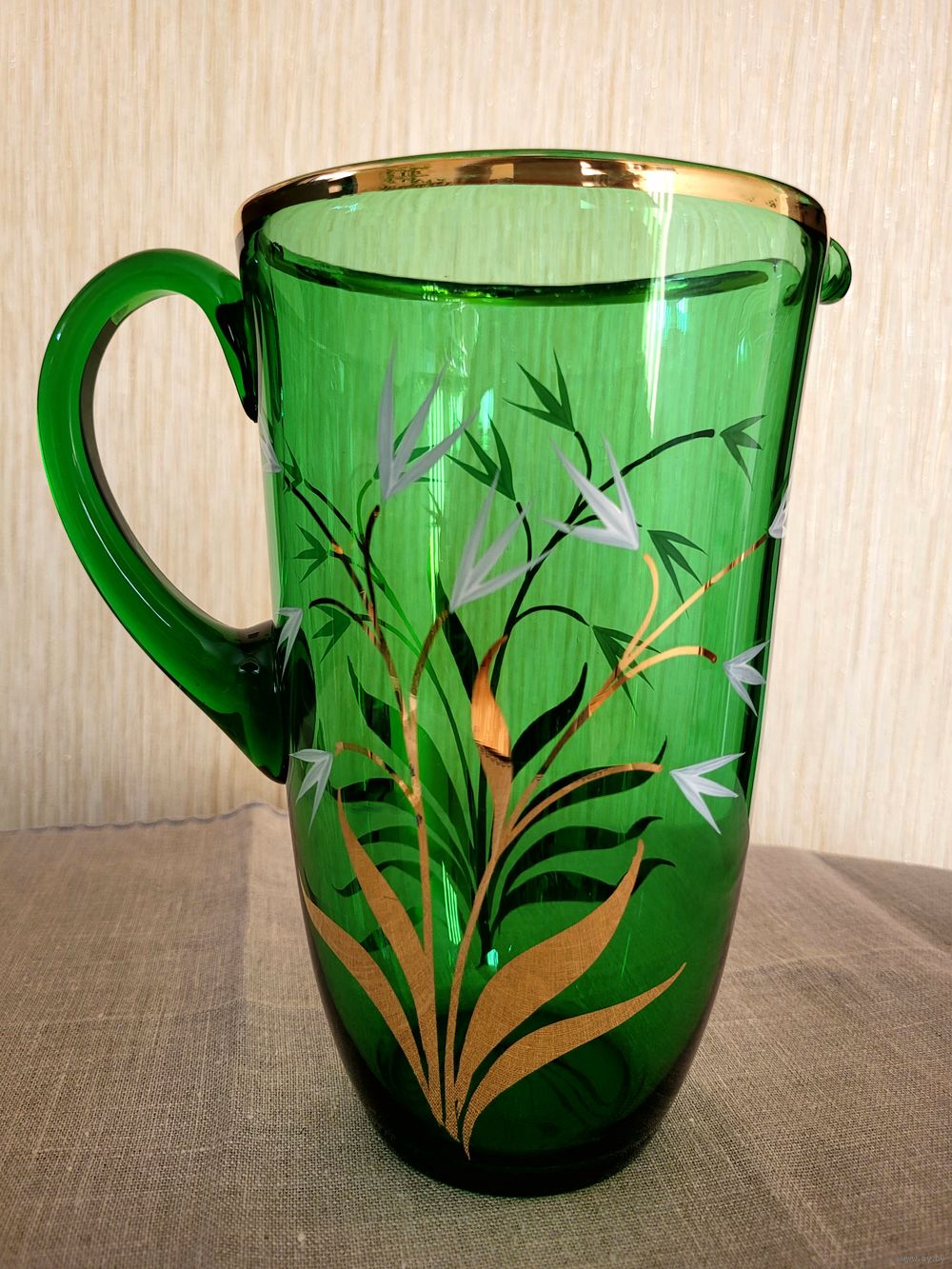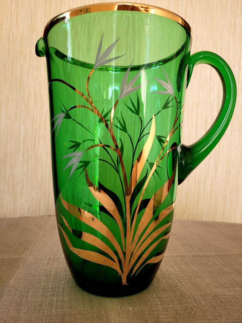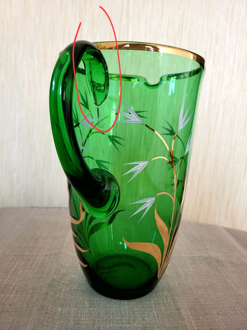 Кувшин для воды, объём 2 л, высота 20,5 см, диаметр раскрытия 12,5 см. Богемское зелёное стекло, золочение, ручная роспись. Позолота сохранна. Чехословакия периода СССР. Есть дефект - трещина в районе ручки, отражён на фото. Наличие дефекта учтено в цене. Дополнительные фото по запросу. При покупке предметов с дефектами все вопросы задавайте заранее, прежде чем делать покупку.