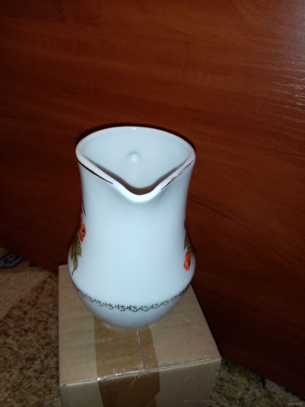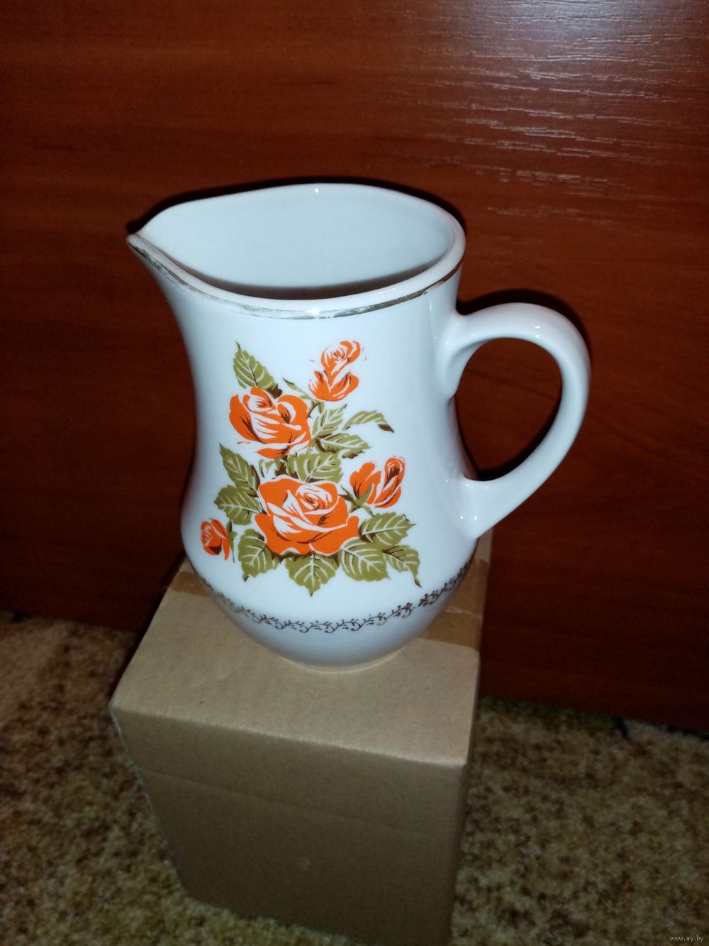 Изделие украшено классическим деколем с изображением оранжевых роз и зеленых листьев. По нижней части тулова и краю горлышка проходит золотистый фигурный орнаментальный фриз.