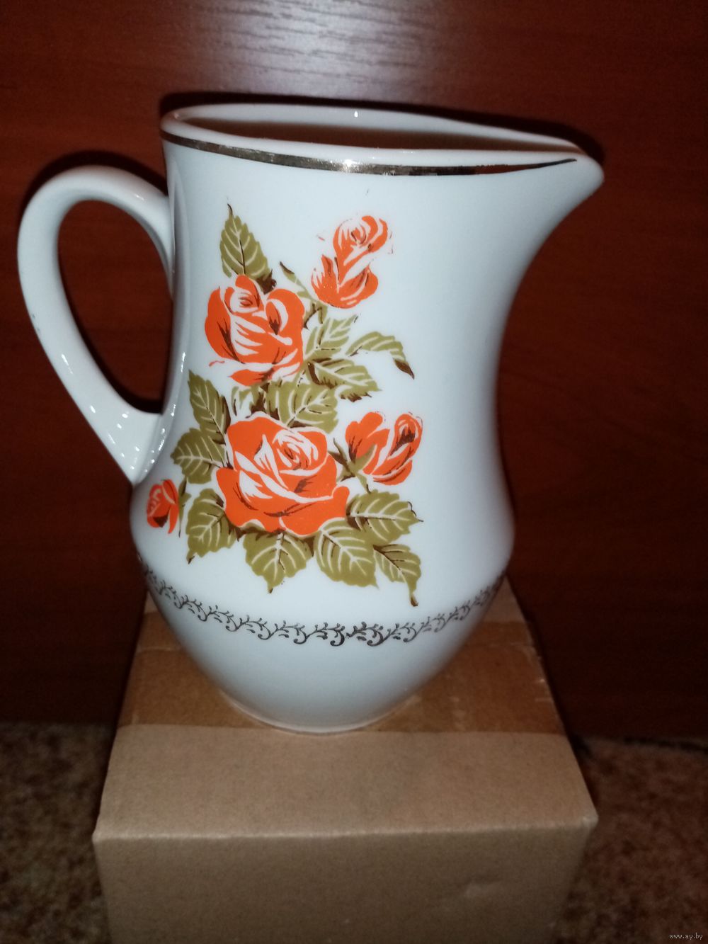 Изделие украшено классическим деколем с изображением оранжевых роз и зеленых листьев. По нижней части тулова и краю горлышка проходит золотистый фигурный орнаментальный фриз.