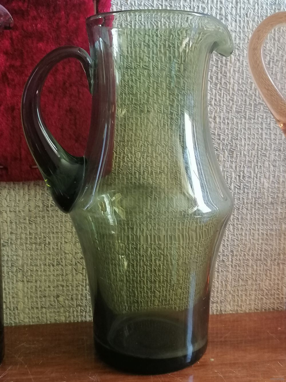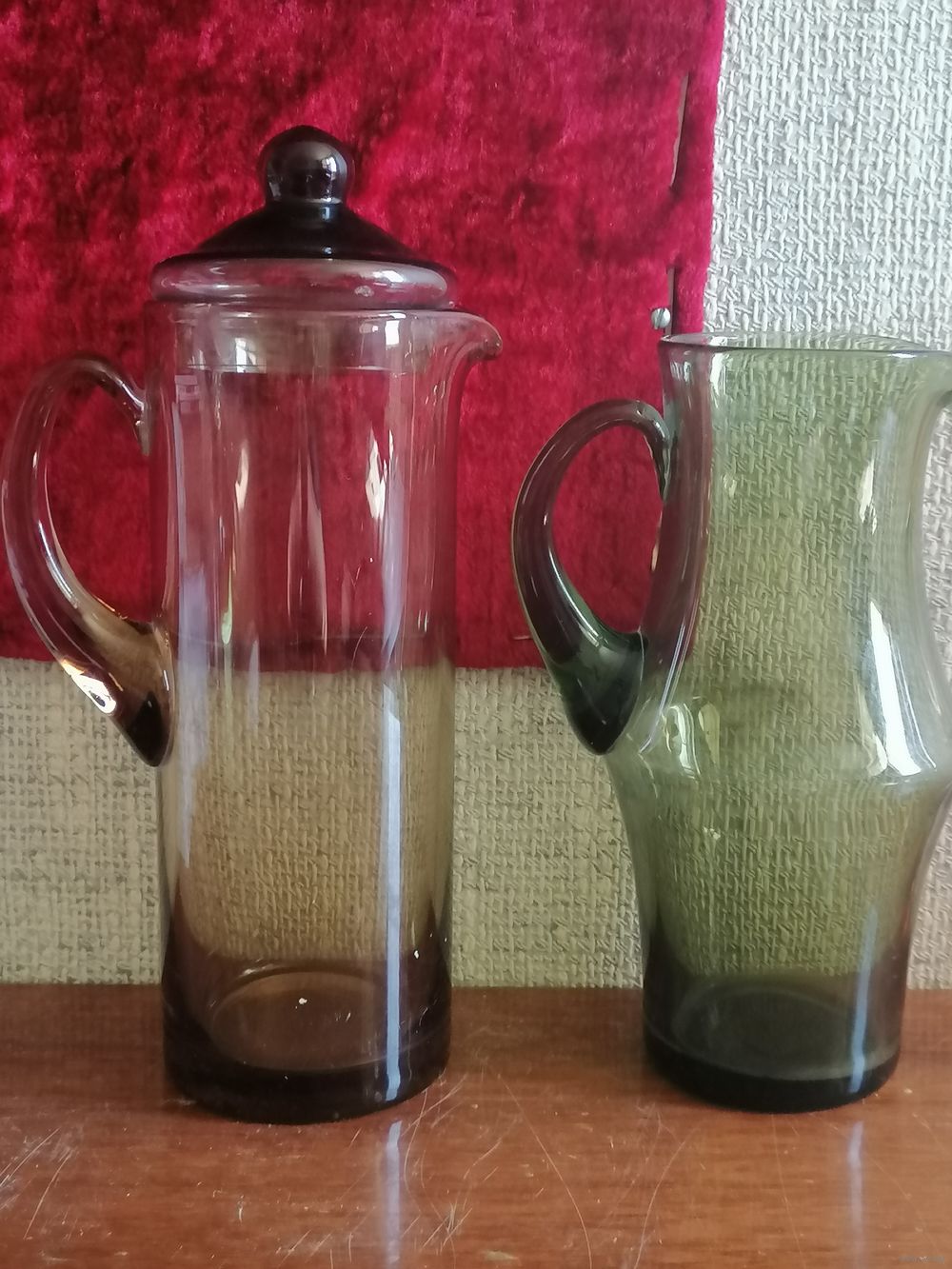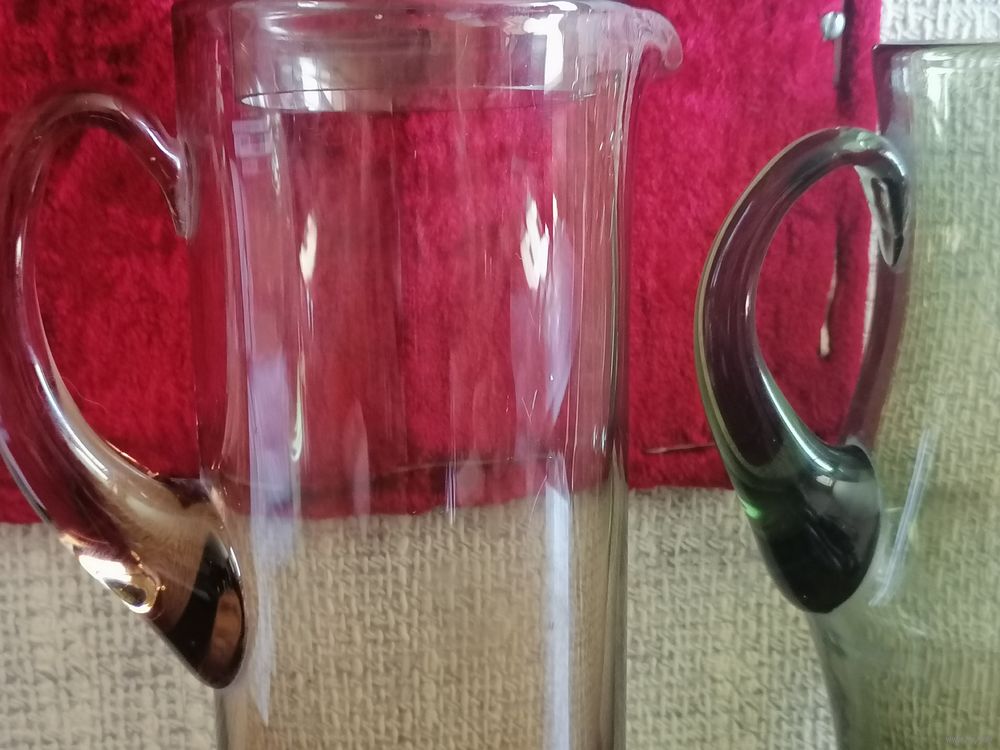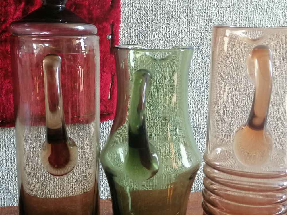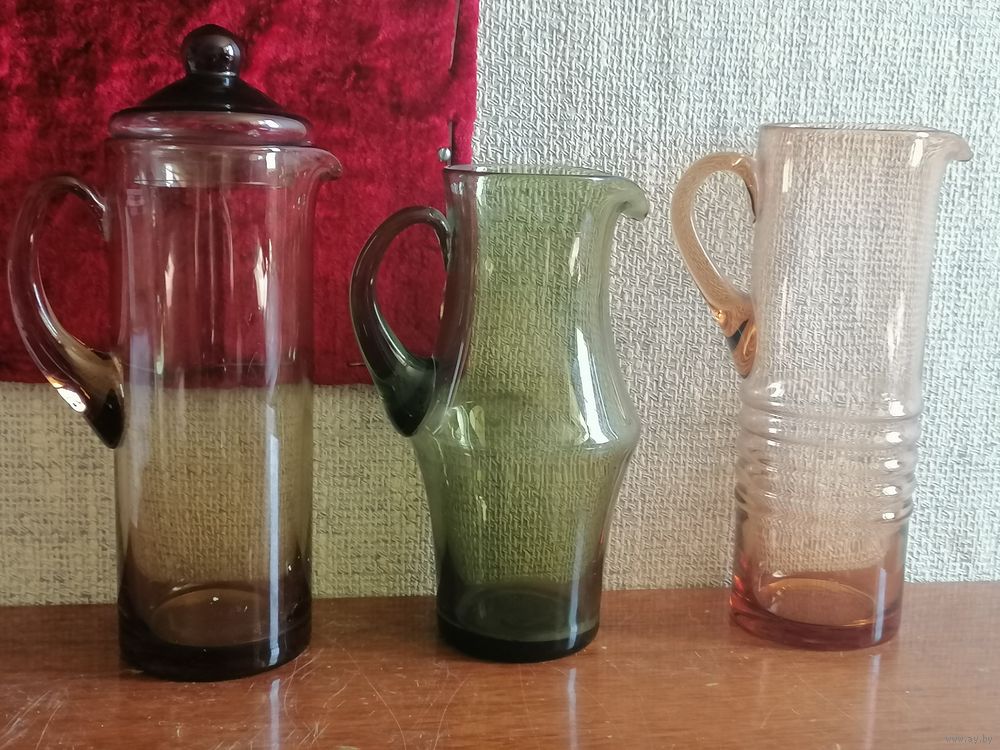 Кувшины из СССР. Зелёное стекло.Высота около 23см.Тот который без крышки высота около 25см.Кувшин с крышкой вместе высота с ней-около 28-29см.Без крышки высота около 24см.Сколов и трещин нет.Стояли в секции.