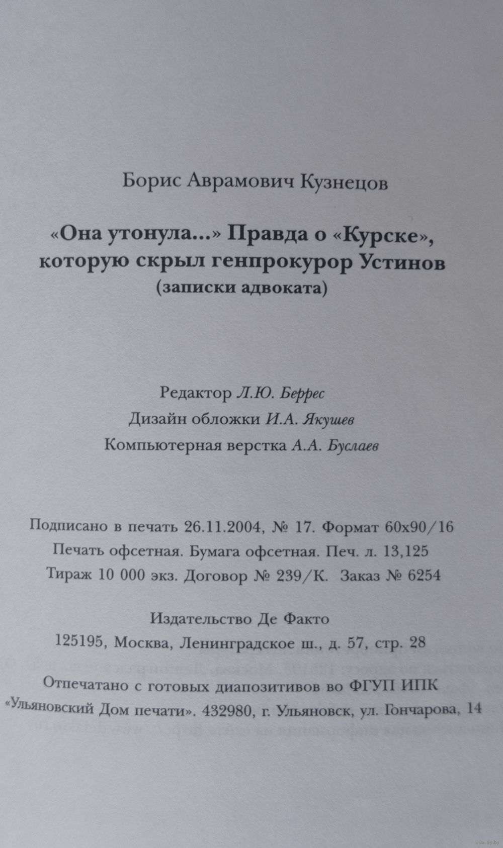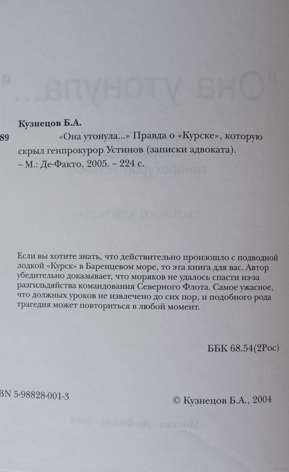 Кузнецов. Она утонула… Правда о "Курске", которую скрыл генпрокурор Устинов. Изд. Де-Факто 2005г. 224 страницы.
