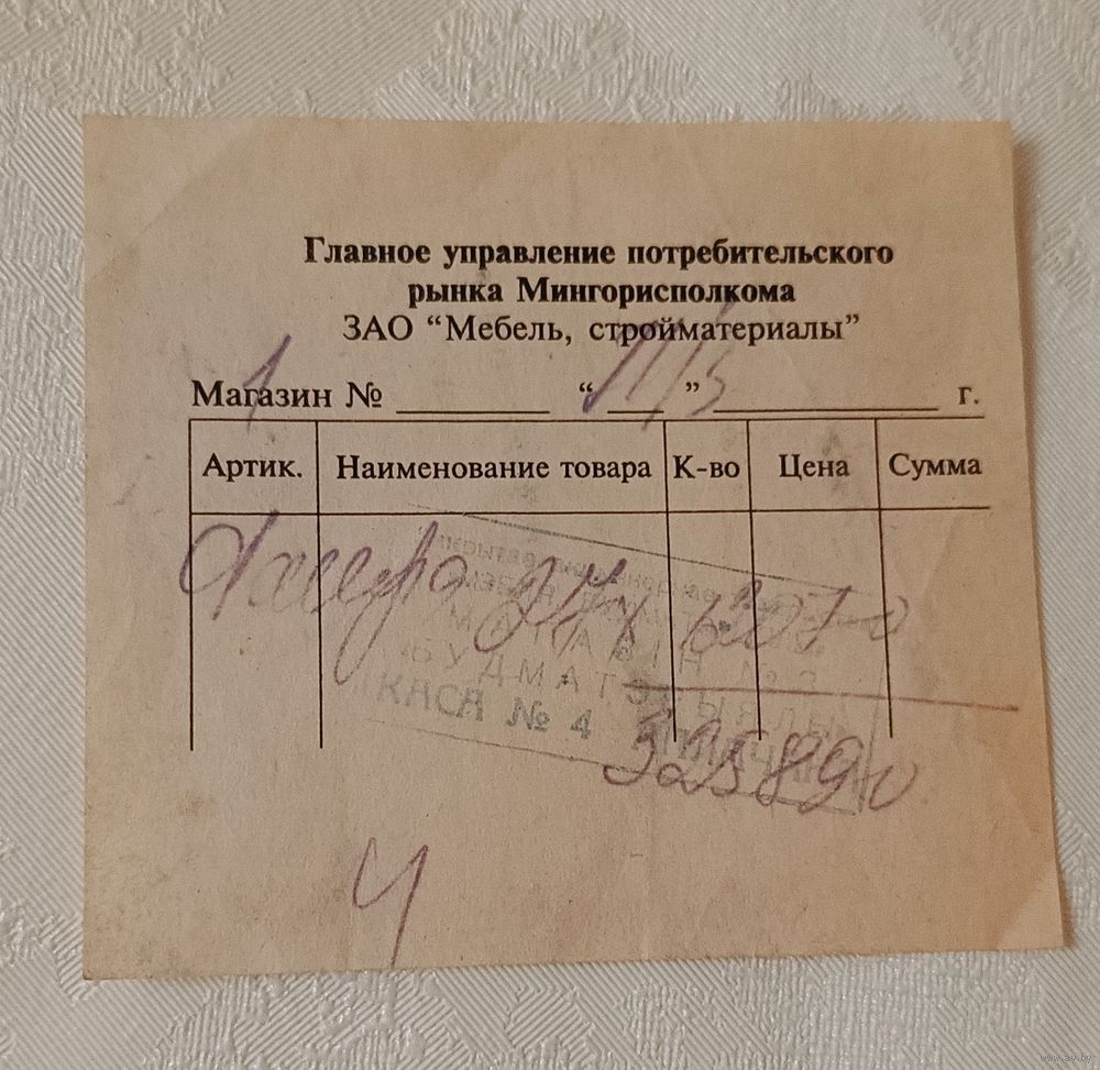 На фотографии представлена квитанция или товарный чек от ЗАО "Мебель, стройматериалы", относящегося к Главному управлению потребительского рынка Мингорисполкома.