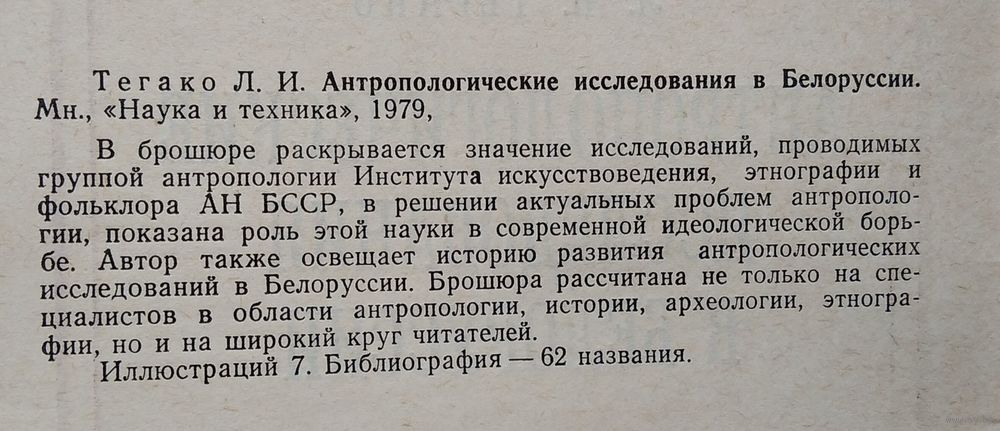 Л. И. Тегако. Антропологические исследования в Белоруссии. - Минск : Наука и техника, 1979. - 44 c. Мягкая обложка