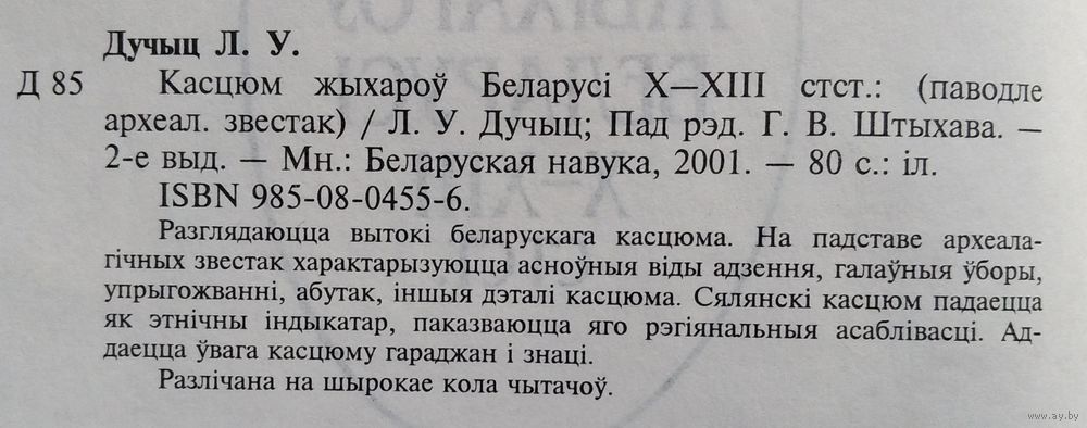 Л. У. Дучыц. Касцюм жыхароў Беларусі Х―XIII стст.: (паводле археалагічных звестак). Мінск : Беларуская навука , 2001 г. 78 с. Мяккая вокладка.