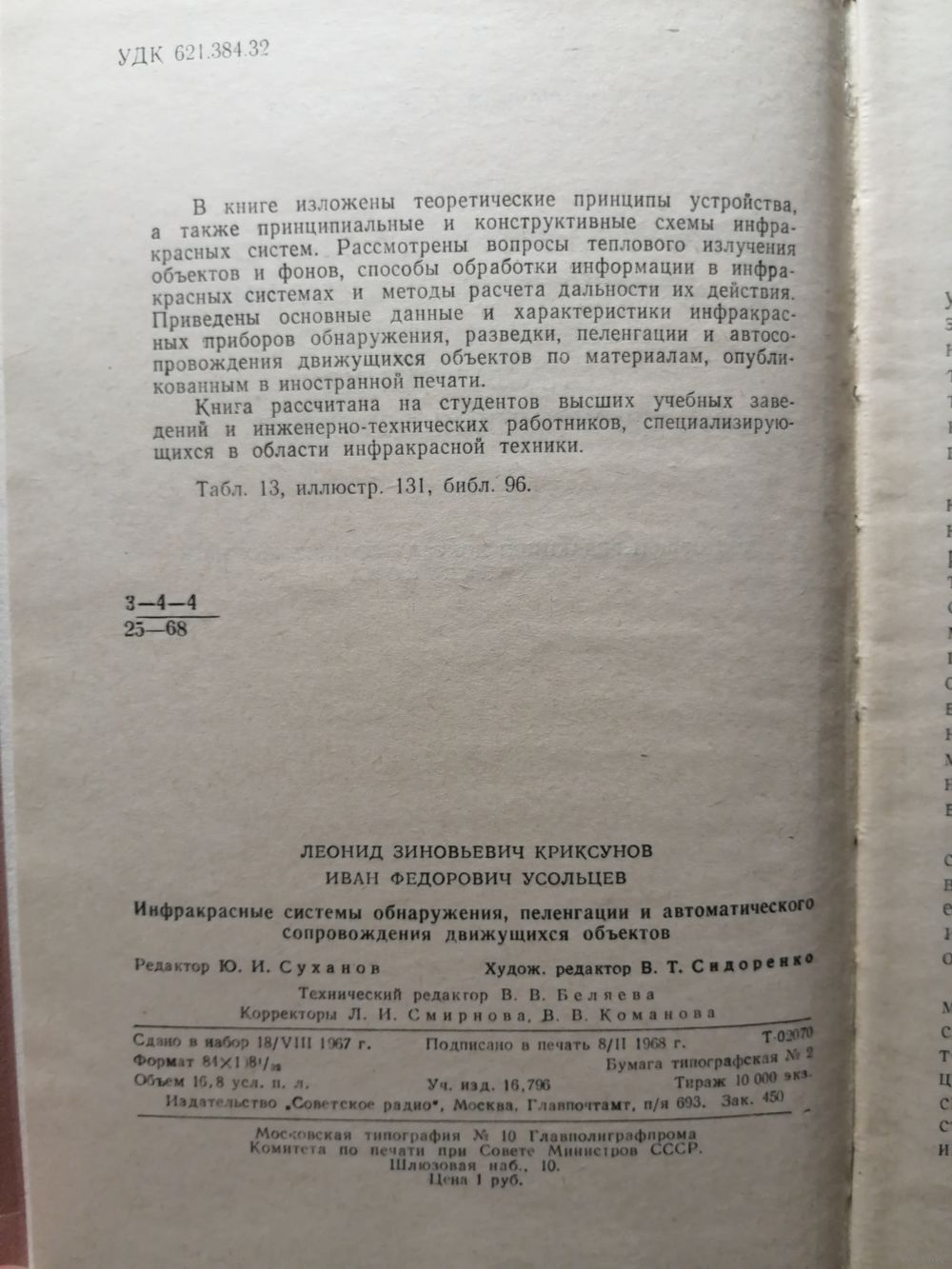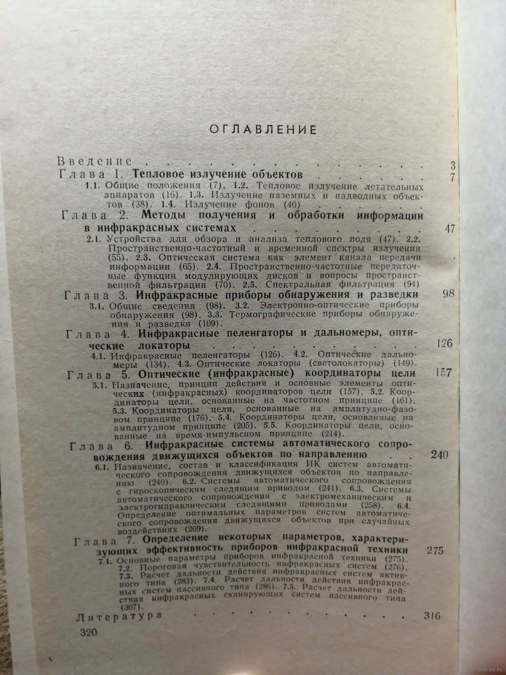 В книге изложены теоретические принципы устройства,а также принципиальные и конструктивные схемы инфракрасных систем. Рассмотрены вопросы теплового изучения объектов и фонов, способы обработки информации в инфракрасных системах и методы расчета дальности их действия. Приведены основные данные и характеристики инфракрасных приборов обнаружения, разведки, пеленгации и автосопровождения движущихся объектов по материалам, опубликованным в иностранной печати. Книга рассчитана на студентов высших учебных заведений и инженерно-технических работников, специализирующихся в области инфракрасной техники.