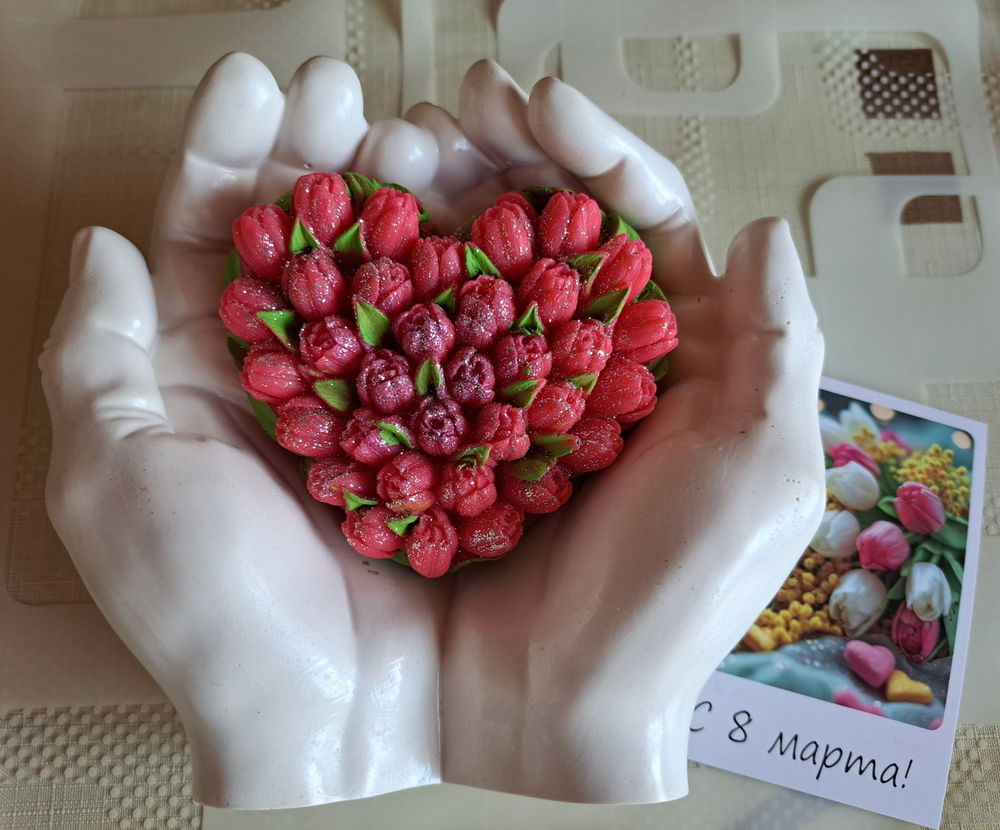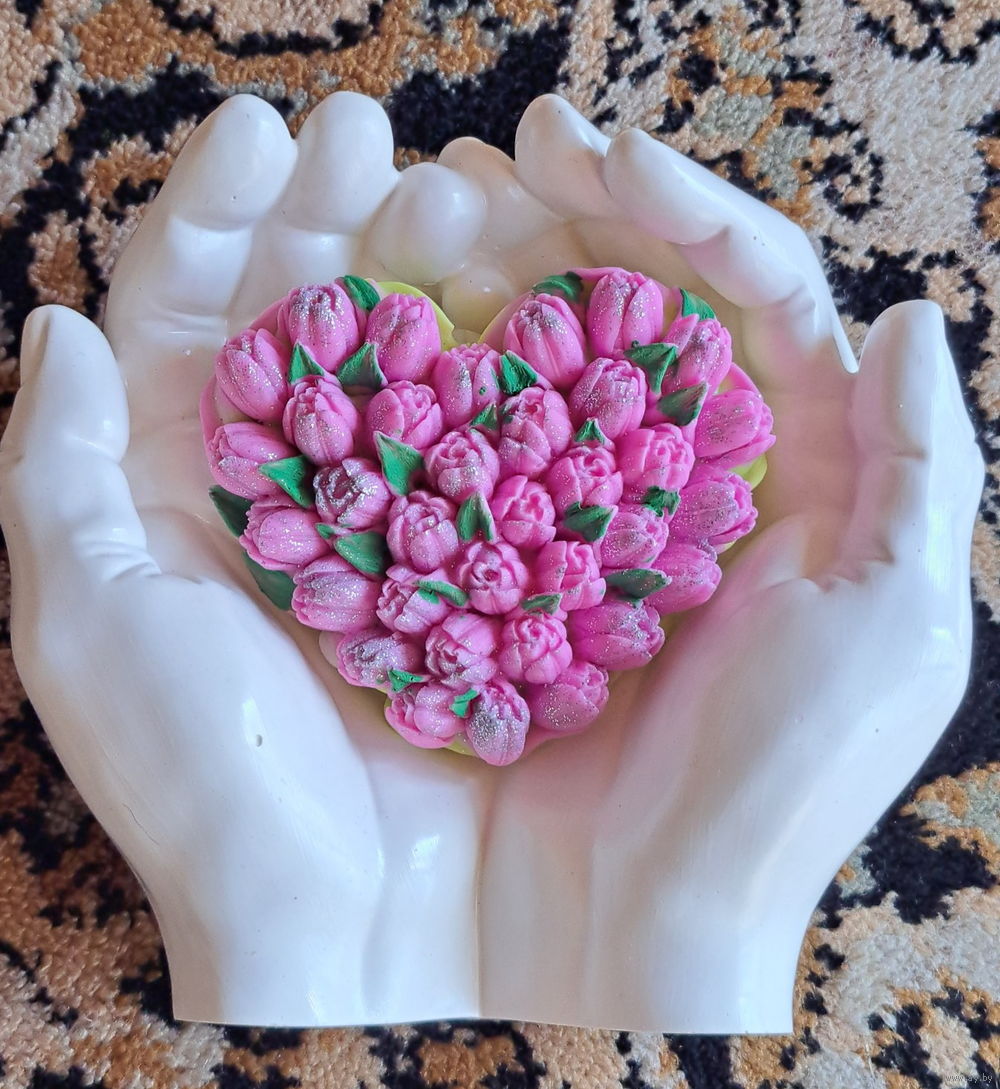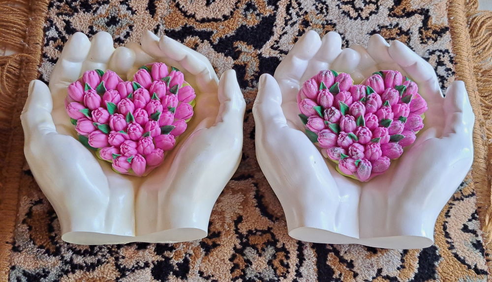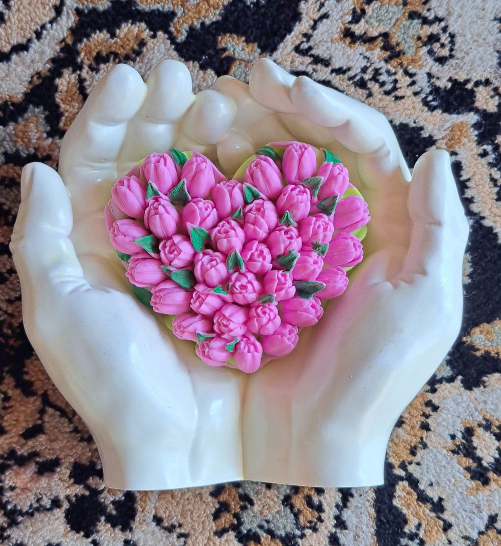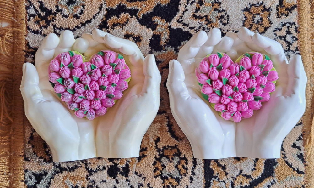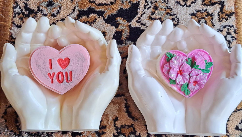 Ладони, новые, ручная работа из гипса в форме рук Адама для интерьера+ ароматное мыло в форме сердечка! Размеры: ширина в сторону-15,5см, ширина сверху вниз-14,8см, высота-6,8см, вес изделия-500гр. Можно использовать как кашпо, вазу, подсвечник, поднос, шкатулку, подставку, пепельницу. Подойдет для подарка своим близким и родным на любой праздник.