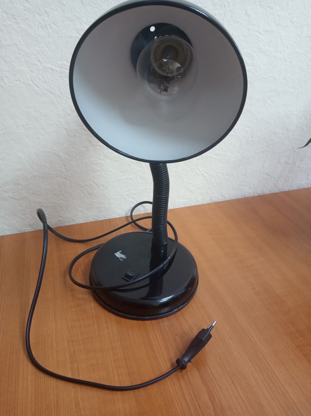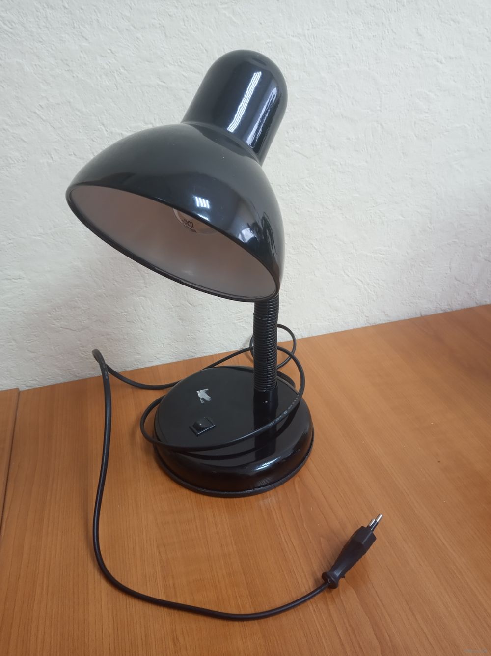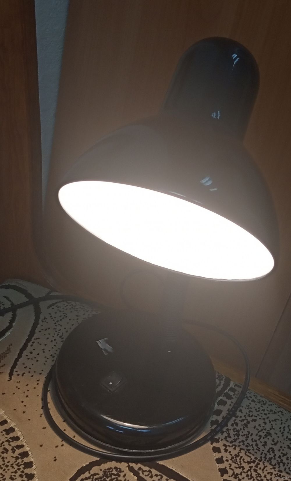 Лампа настольная черного цвета, в рабочем состоянии.