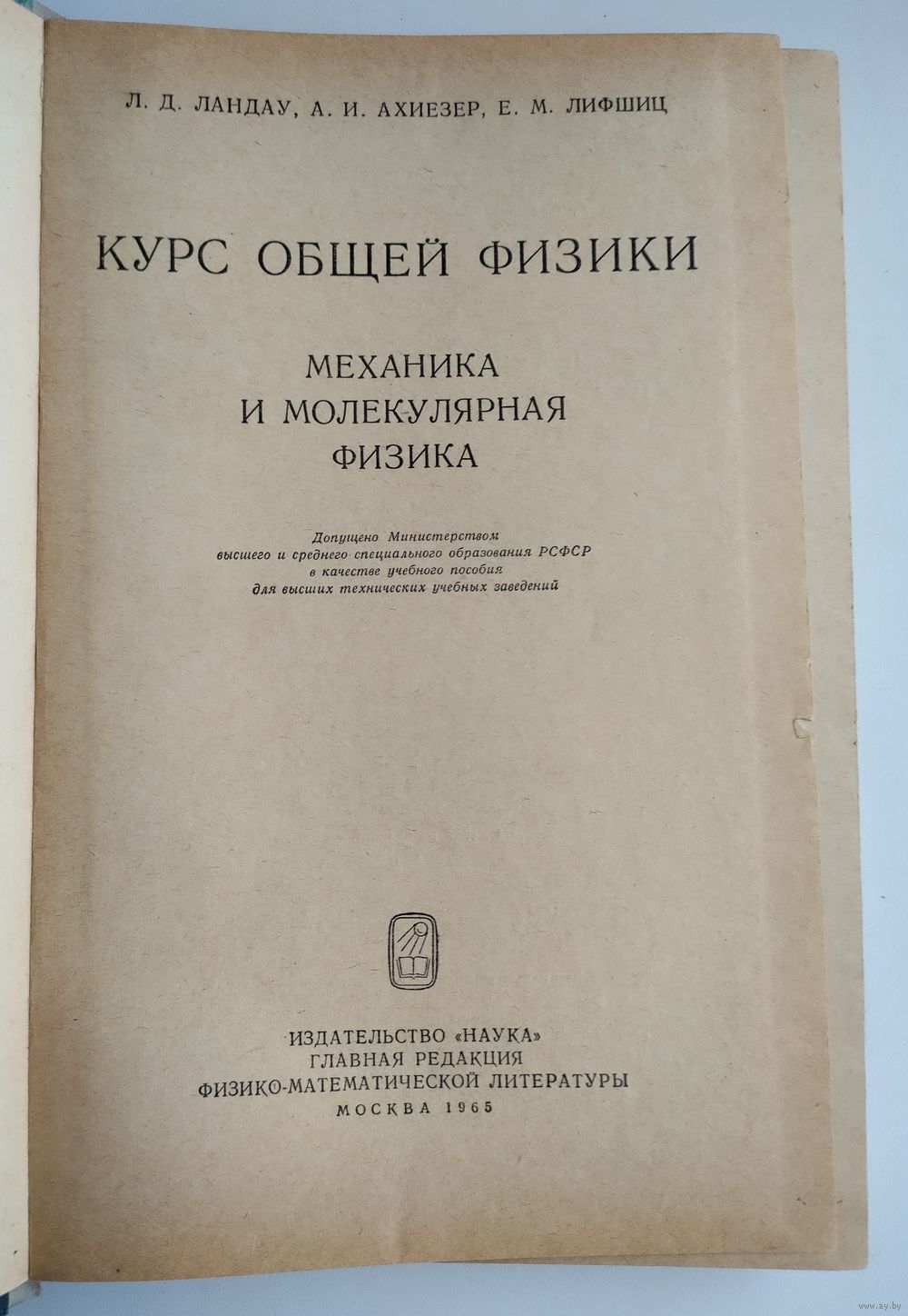 Ландау Л., Ахиезер А., Лифшиц Е. Курс общей физики. Механика и молекулярная физика. Учебное пособие для ВТУЗов. М.: Главная редакция физико-математической литературы изд-ва «Наука», 1965г., 384 с., с илл. Твёрдый переплёт. Обычный формат.