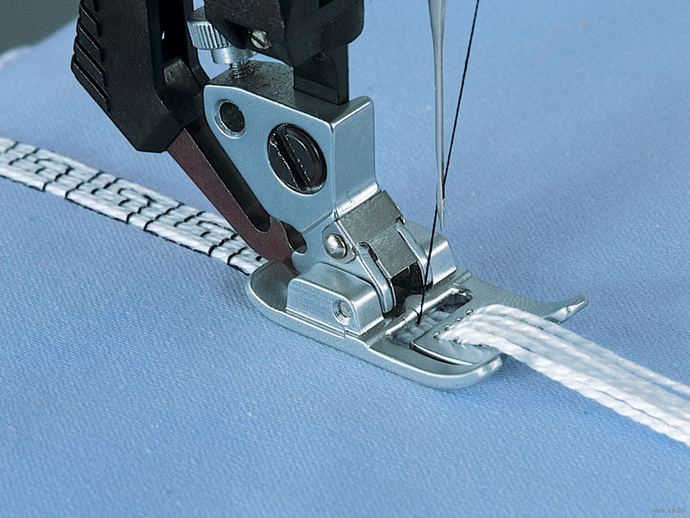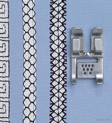 При использовании этой лапки получаются отличные декоративные эффекты. В отверстия лапки можно заправить различные типы тонких шнуров, шелковых нитей, мулине или блестящие нитки и прошить по ним любой узорной или декоративной строчкой.