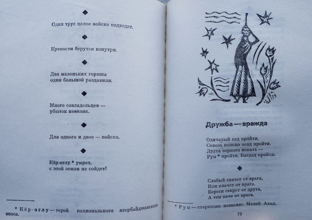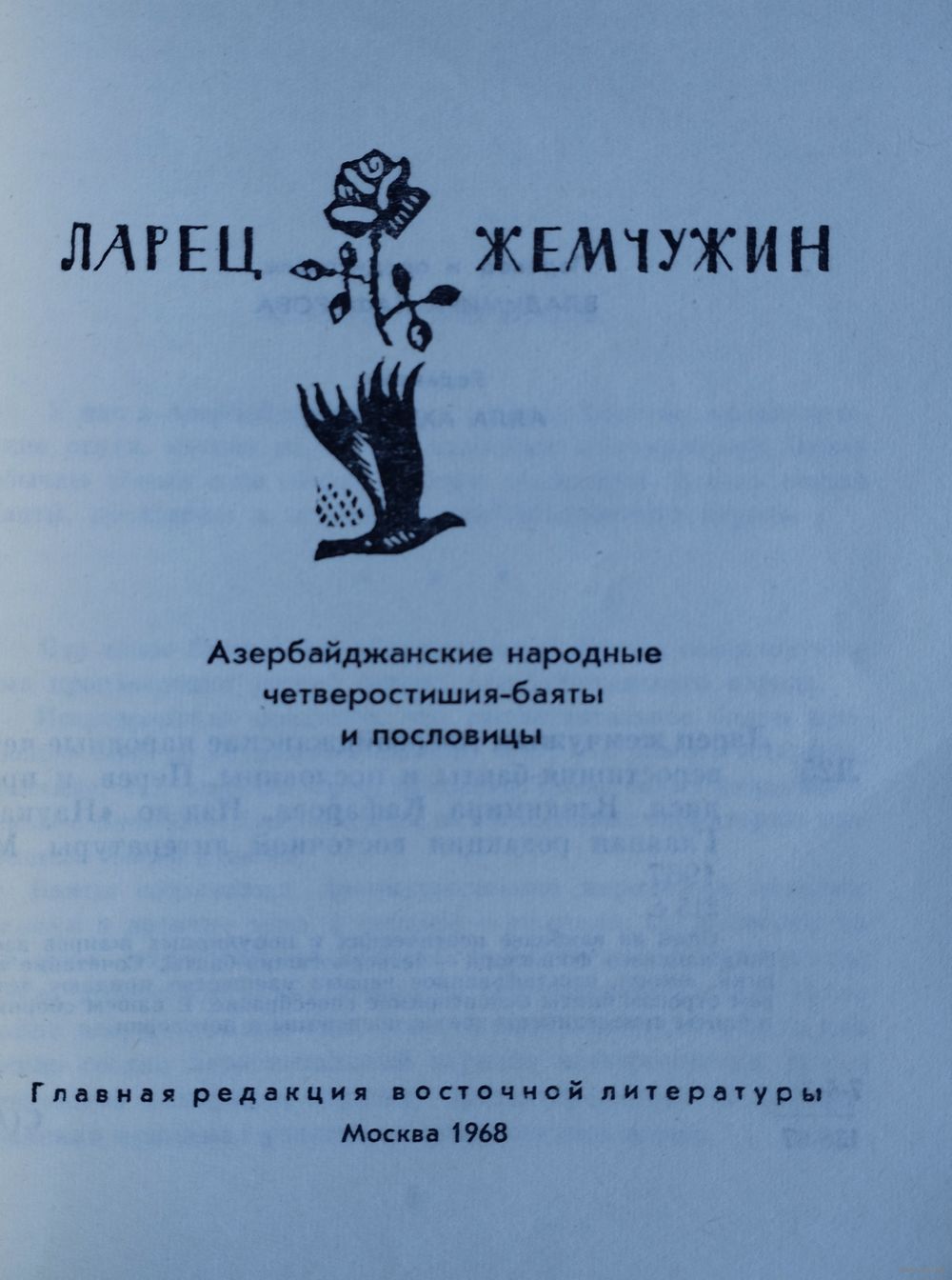 216 стр. Настоящее издание знакомит русского читателя с лучшими, типичными образцами азербайджанской народной поэзии. В сборнике представлены произведения разных видов и жанров, среди которых фольклорные памятники глубокой старины и недавнего прошлого. Большую часть книги занимают баяты — четверостишия, отличающиеся меткостью наблюдений, афористичностью языка, отточенностью художественной формы. Переводы многих текстов выполнены специально для данного издания.
