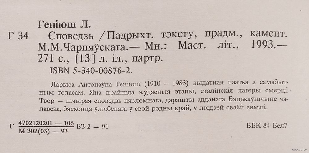 Ларыса Геніюш. Споведзь. Мінск: Мастацкая літаратура, 1993 г. 269 с. Цверды пераплет.