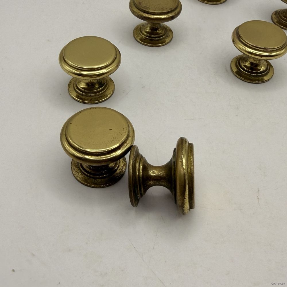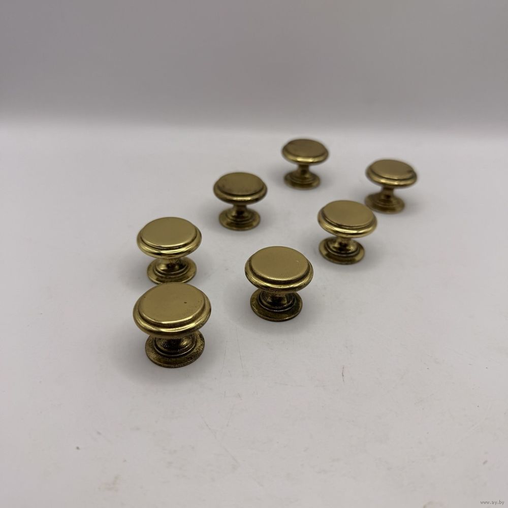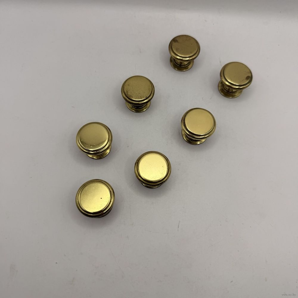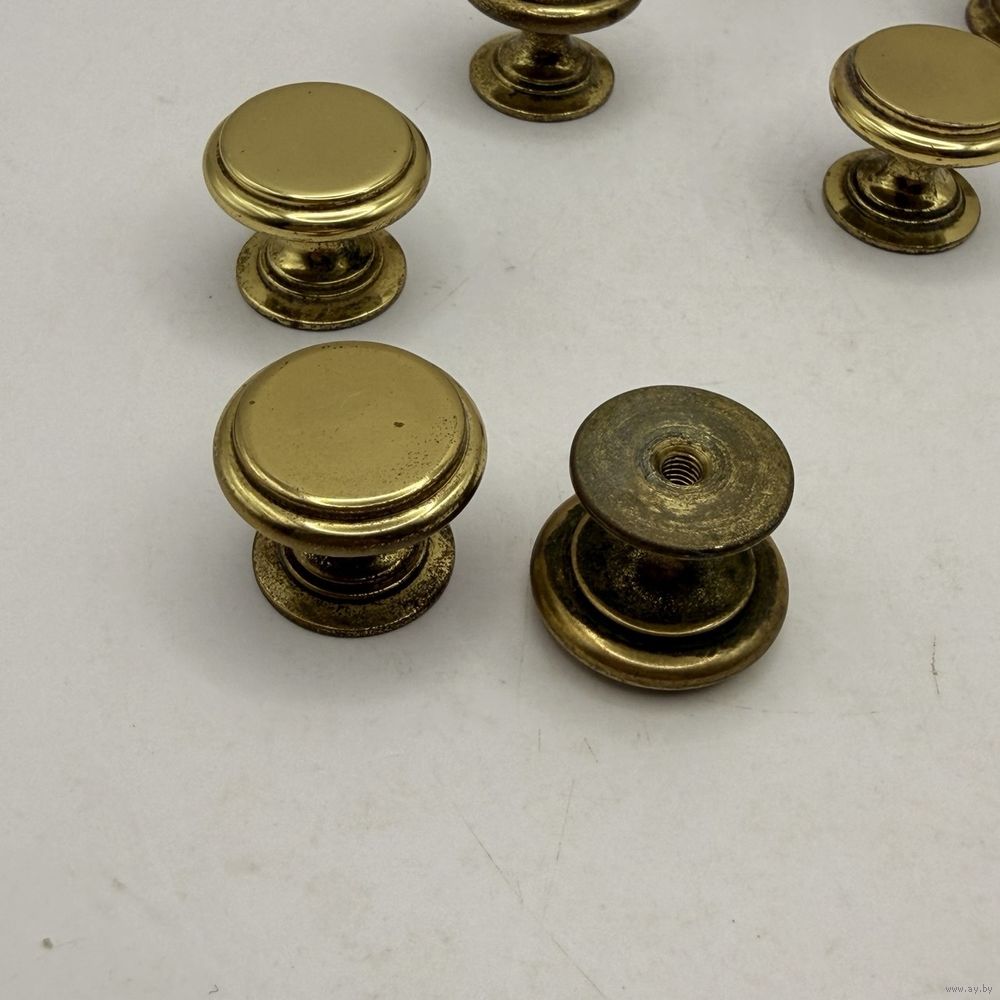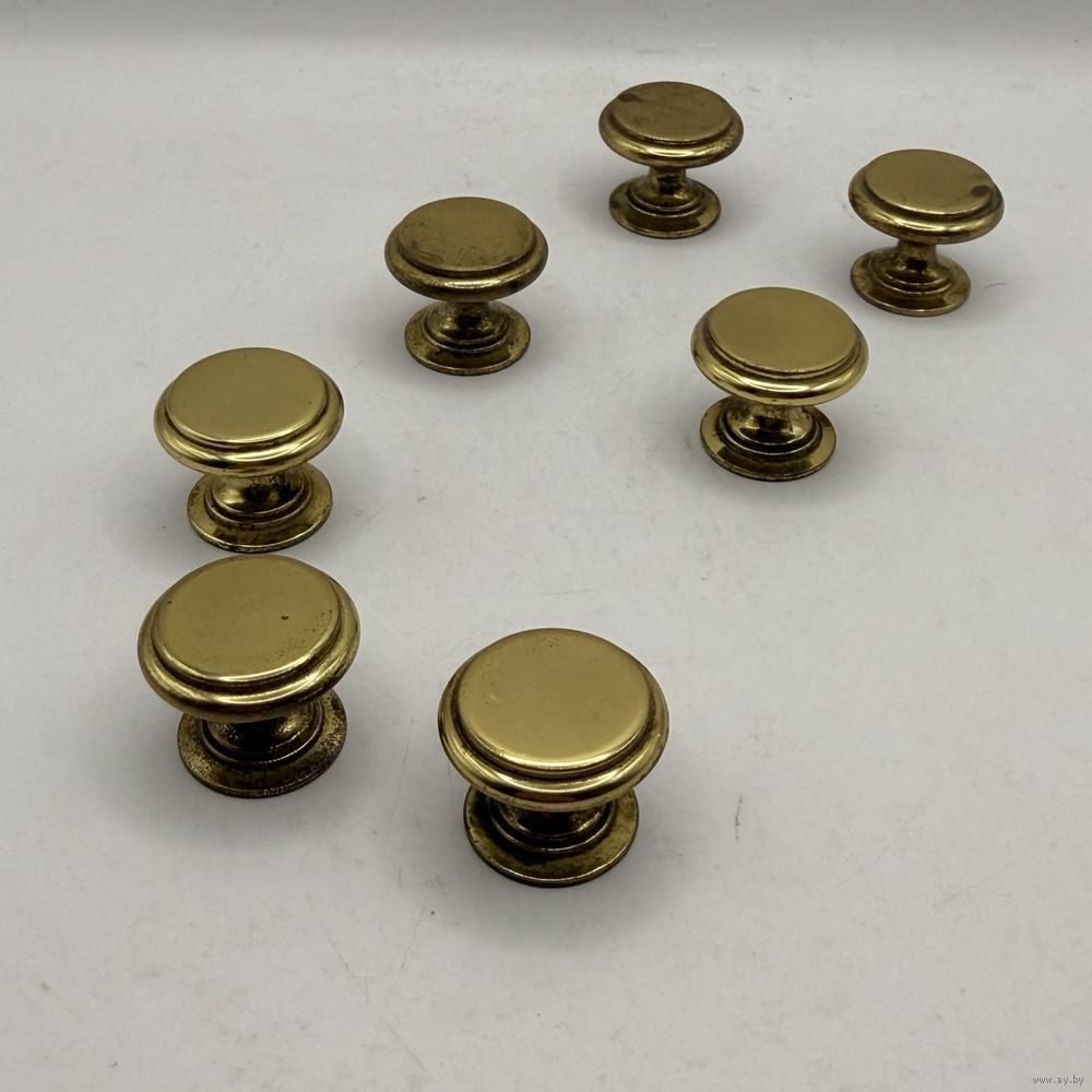 Винтажные латунные ручки для мебели с лаконичным дизайном. В наборе 7 шт. Франция. 1970-е г.г. Диаметр 2,3 см, глубина 2 см. Вес 1 ручки 30 г. С внутренней резьбой. Естественная патина.