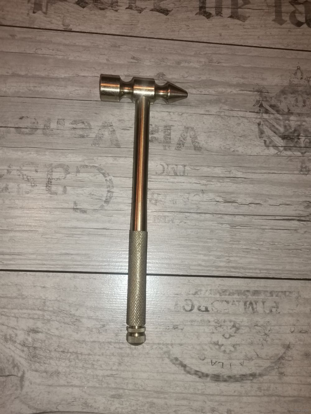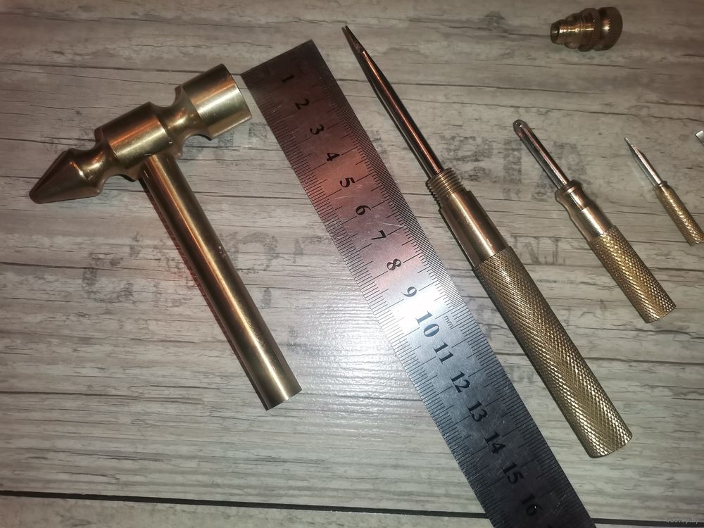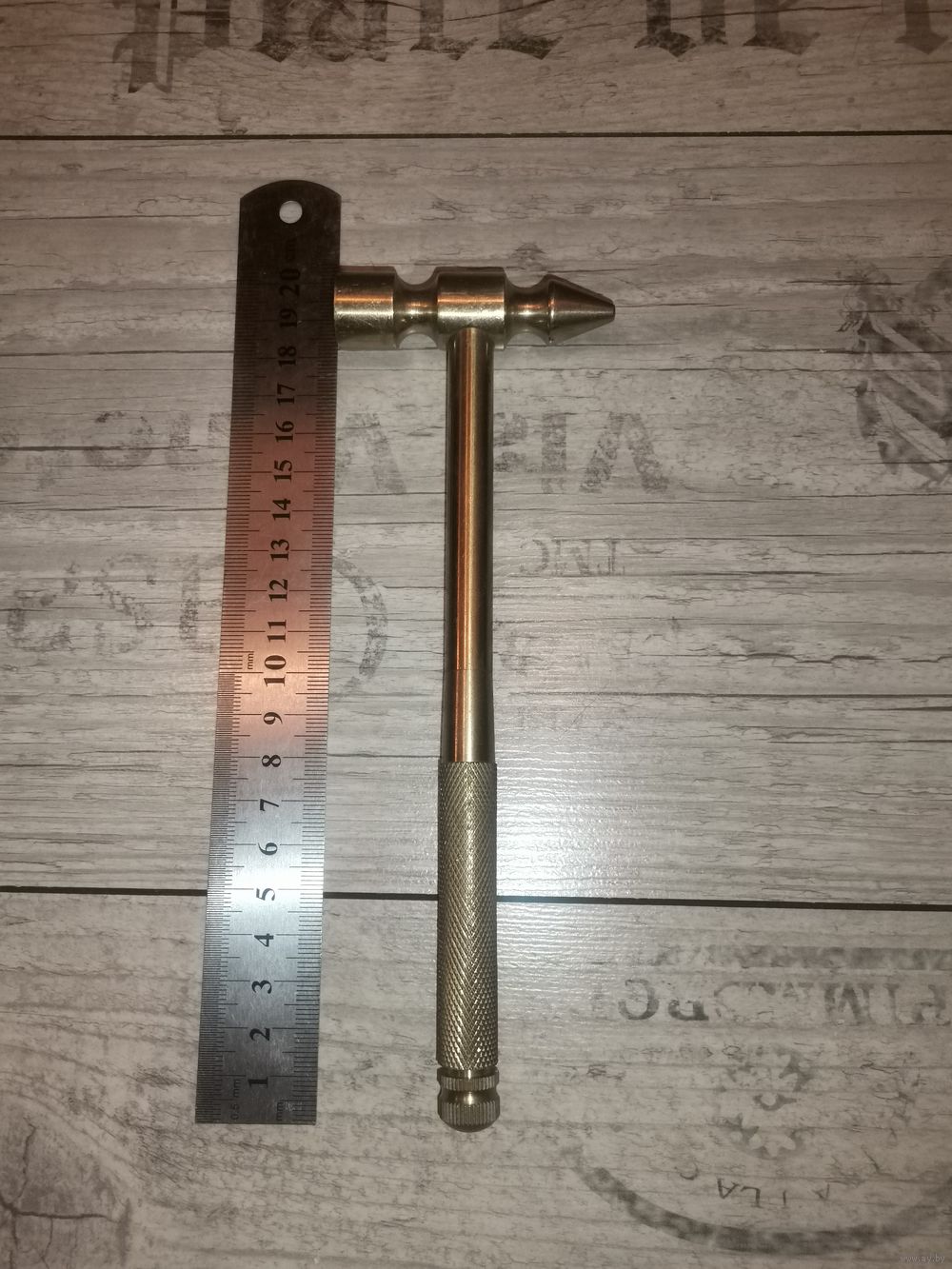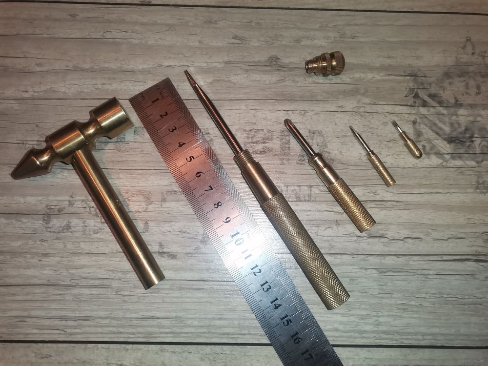 Латунный молоток с четырьмя отвёртками, длина 19 см.