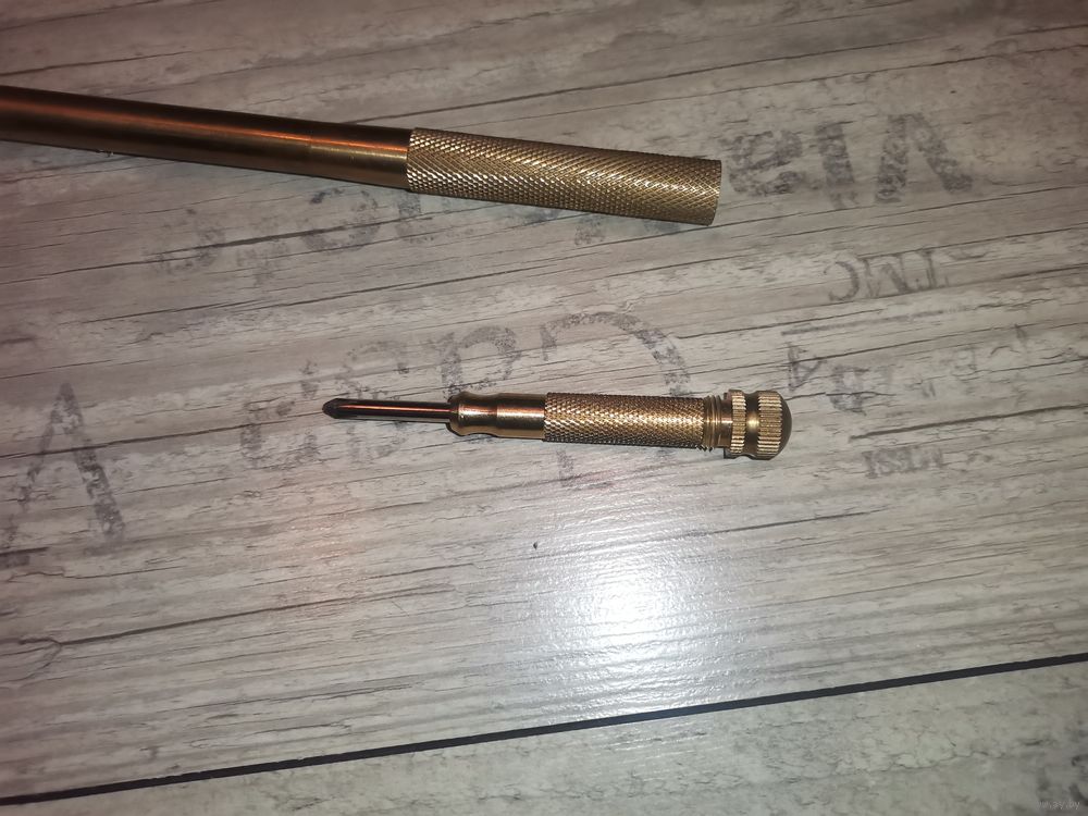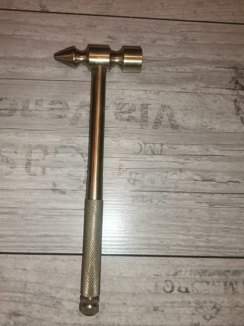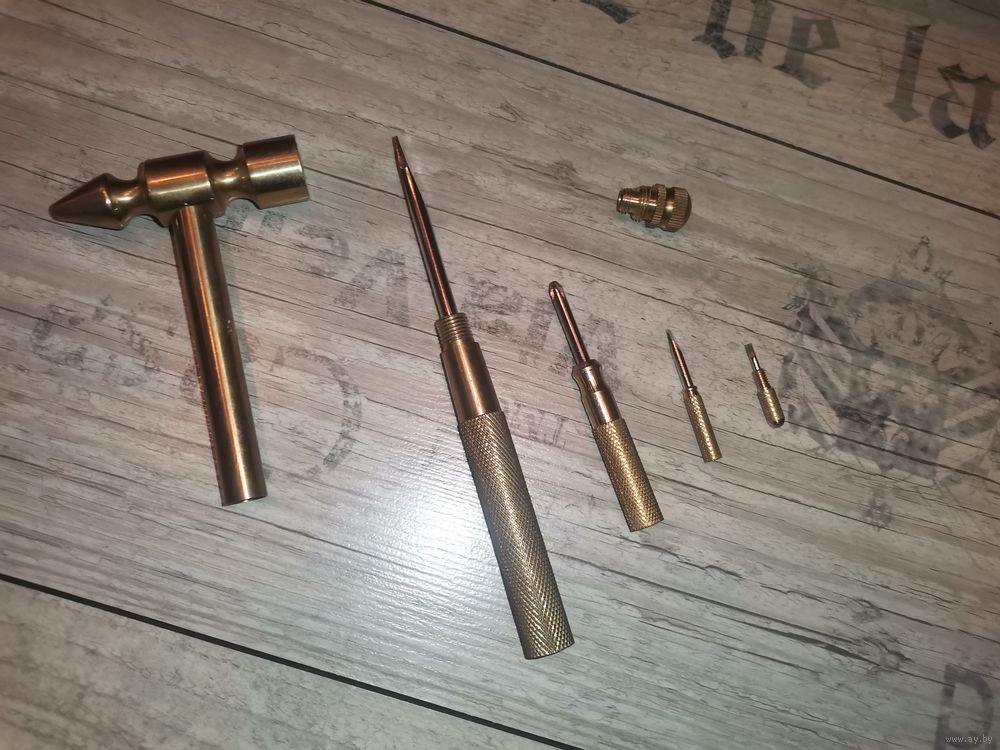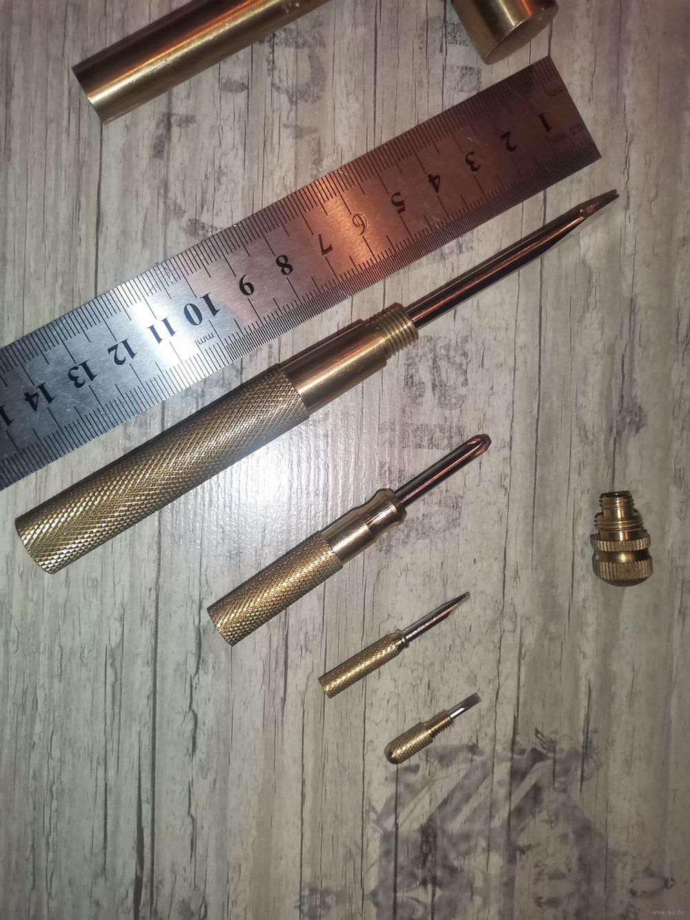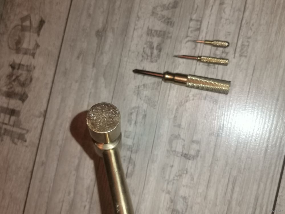 Латунный молоток с четырьмя отвёртками, длина 19 см.