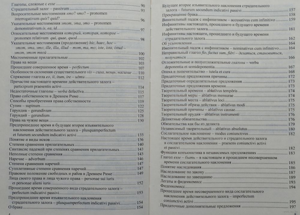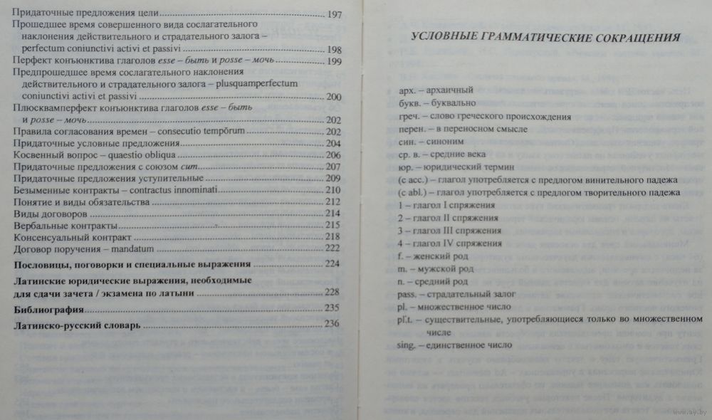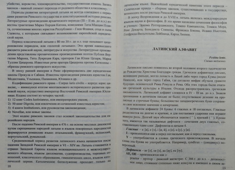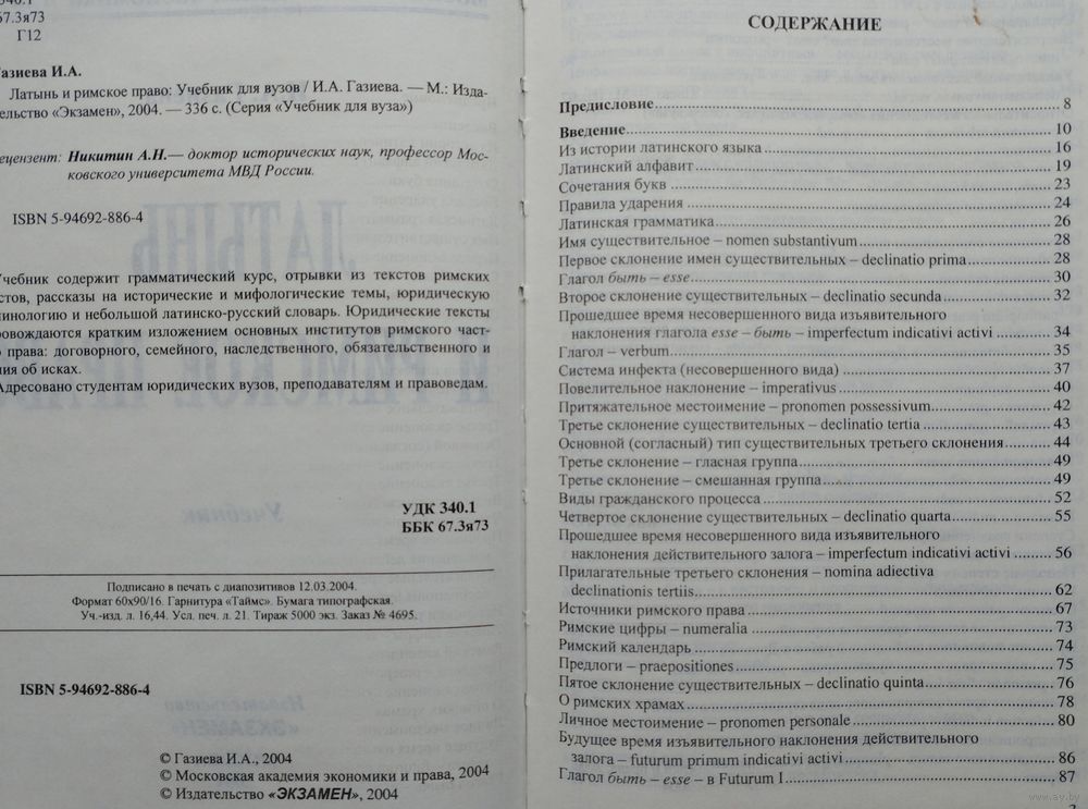 Большой формат. Тираж 5000 экз. 338 стр. Учебник содержит грамматический курс, отрывки из текстов римских юристов, рассказы на исторические и мифологические темы, юридическую терминологию и небольшой латинско-русский словарь. Юридические тексты сопровождаются кратким изложением основных институтов римского частного права: договорного, семейного, наследственного, обязательственного и учения об исках. Адресован студентам юридических вузов, преподавателям и правоведам.