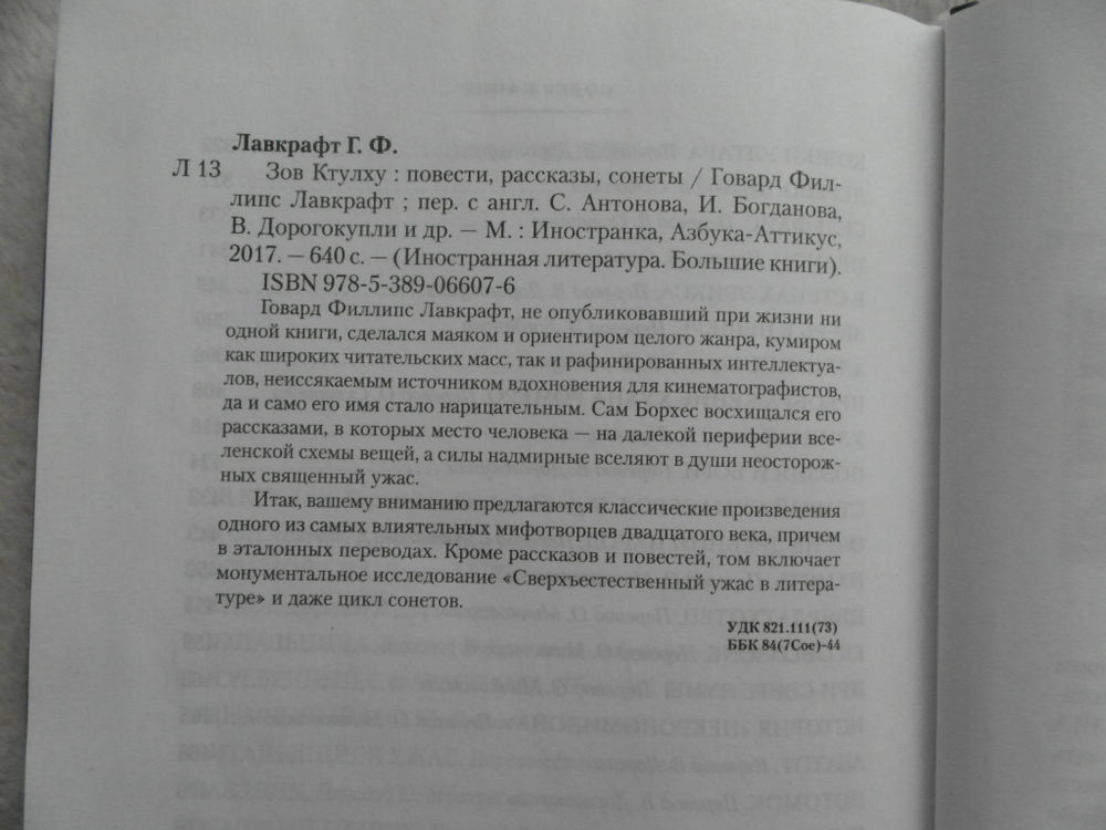 При жизни этот писатель не опубликовал ни одной книги, после смерти став кумиром как массового читателя, так и искушенного эстета, и неиссякаемым источником вдохновения для кино- и игровой индустрии: его называли `Эдгаром По ХХ века`, гениальным безумцем и адептом тайных знаний: его творчество уникально настолько, что потребовало выделения в отдельный поджанр: им восхищались Роберт Говард и Клайв Баркер, Хорхе Луис Борхес и Айрис Мердок. Один из самых влиятельных мифотворцев современности, человек, оказавший влияние не только на литературу, но и на массовую культуру в целом, создатель `Некрономикона` и `Мифов Ктулху` - Говард Филлипс Лавкрафт. Имя Говарда Лавкрафта известно всему миру как эталон литературы ужаса. Великий мифотворец и мистификатор, он писал о существах и явлениях, даже от мысли о которых можно содрогнуться. Именно он стал прародителем целого жанра хоррора. Величие Лавкрафта признают и современники писателя, и сегодняшние мастера `темной` прозы. В сборник вошел наиболее культовый и известный цикл произведений, которые объединяет зловещая атмосфера, древние книги, объясняющие строение мира, и потусторонние существа - божества Ктулху.