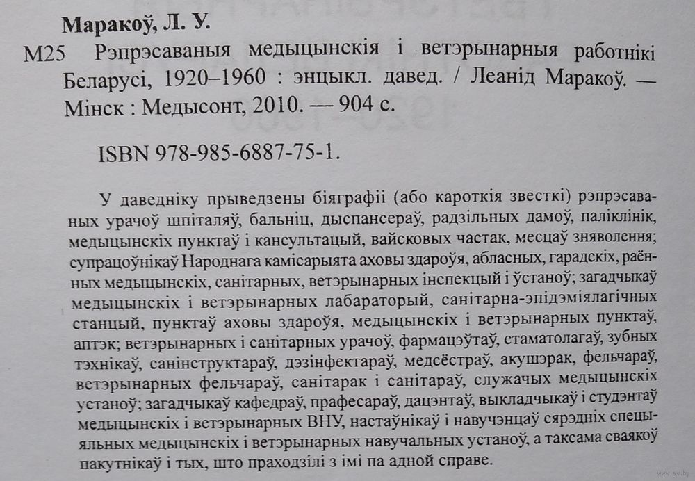 Леанід Маракоў. Рэпрэсаваныя медыцынскія і ветэрынарныя работнікі Беларусі, 1920-1960: энцыклапедычны даведнік. Мінск : Медысонт. 2010 г. 903 с. Цверды пераплет.