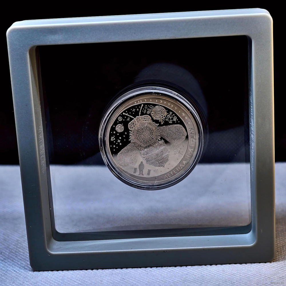 в центре – стилизованное изображение пчелы, мифологических образов и символов белорусских легенд. Справа по кругу надпись: ЛЕГЕНДА ПРА ПЧАЛУ.