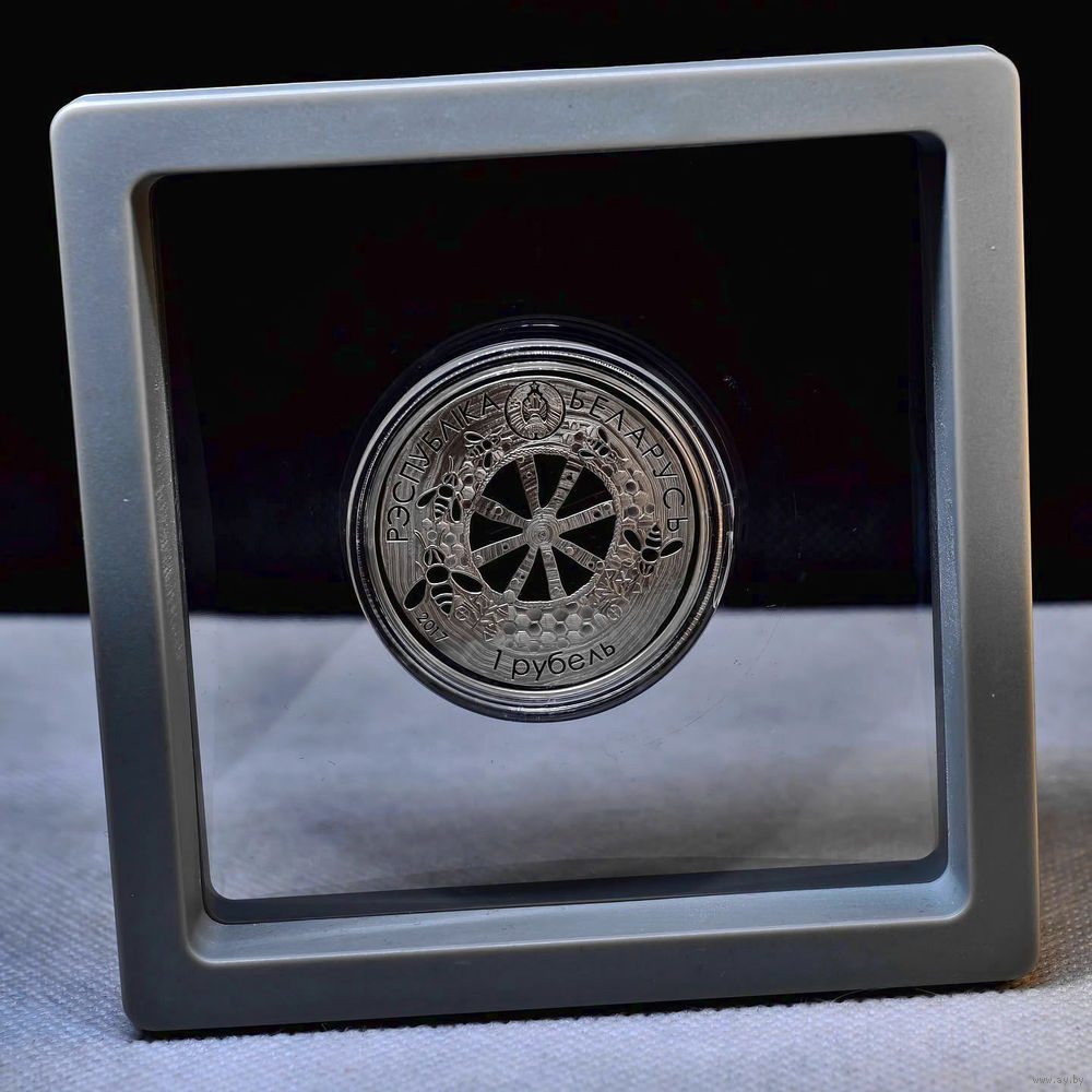 вверху – рельефное изображение Государственного герба Республики Беларусь, по кругу надпись: РЭСПУБЛІКА БЕЛАРУСЬ; в центре на фоне стилизованного изображения колеса прялки расположены изображения пчел и сот; внизу – номинал: 20 РУБЛЁЎ (на серебряной) и 1 РУБЕЛЬ (на медно-никелевой), слева от номинала – год чеканки, справа – проба сплава (на серебряной).