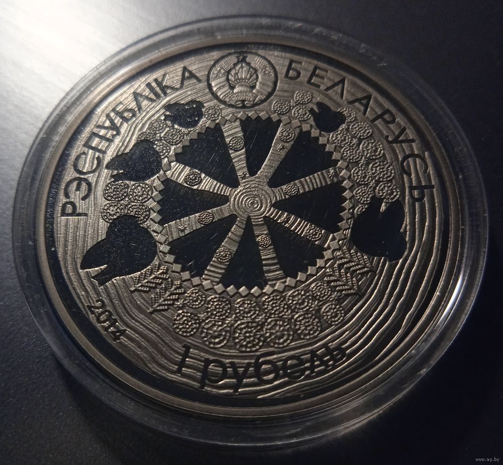 вверху – рельефное изображение Государственного герба Республики Беларусь, по кругу надпись: РЭСПУБЛІКА БЕЛАРУСЬ; в центре на фоне символа вечного движения – колеса прялки, фактура которого переходит в структуру годовых колец на срезах дерева, расположено стилизованное изображение птиц, кружевных снежинок и елочек как образов белорусских легенд и элементов белорусского народного плетения; внизу – номинал: 1 РУБЕЛЬ (на медно-никелевой), слева от номинала – год чеканки.