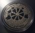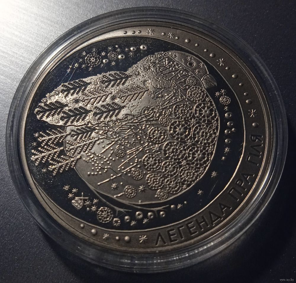 в центре – стилизованное изображение снегиря, на грудке, спинке и крыльях которого рельефные изображения кружевных снежинок, веточек; вокруг птицы – ягодки рябины (любимое лакомство снегирей) и символы белорусских легенд. Справа по кругу надпись: ЛЕГЕНДА ПРА ГІЛЯ.