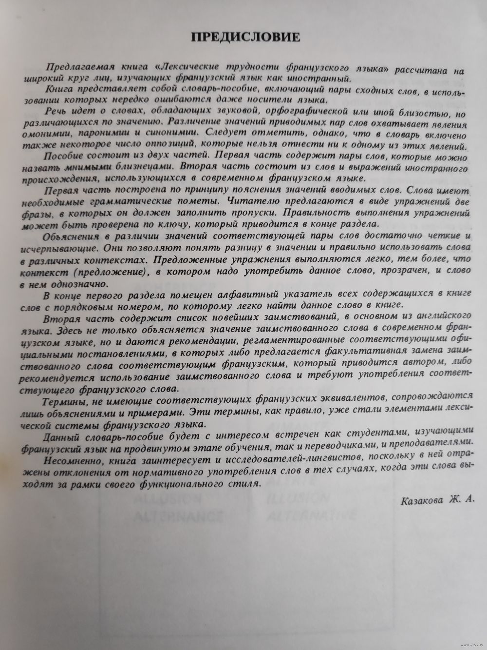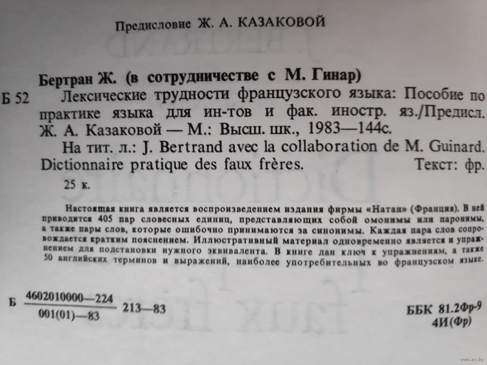 Настоящая книга является воспроизведением издания фирмы «Натан» (Франция). В ней приводится 405 пар словесных единиц, представляющих собой омонимы или паронимы, а также пары слов, которые ошибочно принимаются за синонимы. Каждая пара слов сопровождается кратким пояснением. Иллюстративный материал одновременно является и упражнением для подстановки нужного эквивалента. В книге дан ключ к упражнениям, а также 50 английских терминов и выражений, наиболее употребительных во французском языке.