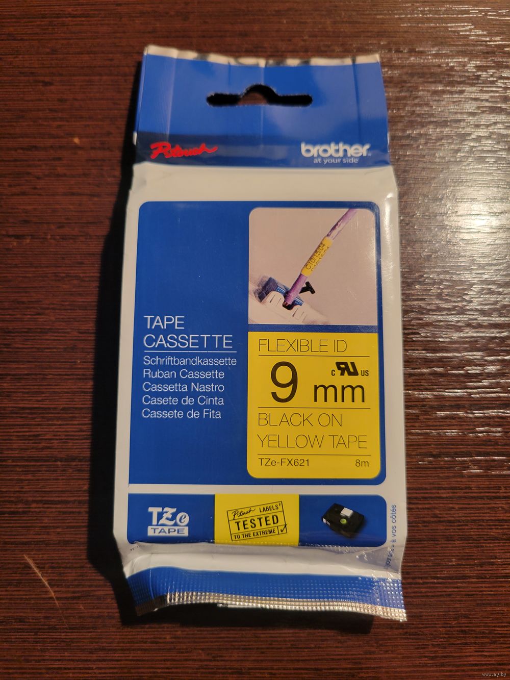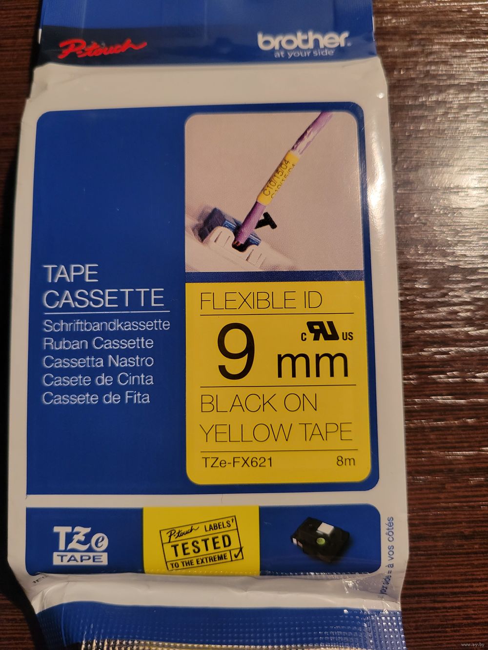 BROTHER TZe-FX621 картридж с оригинальной эластичной ламинированной лентой шириной 9 мм длиной 8 метров чёрный шрифт на желтом фоне.